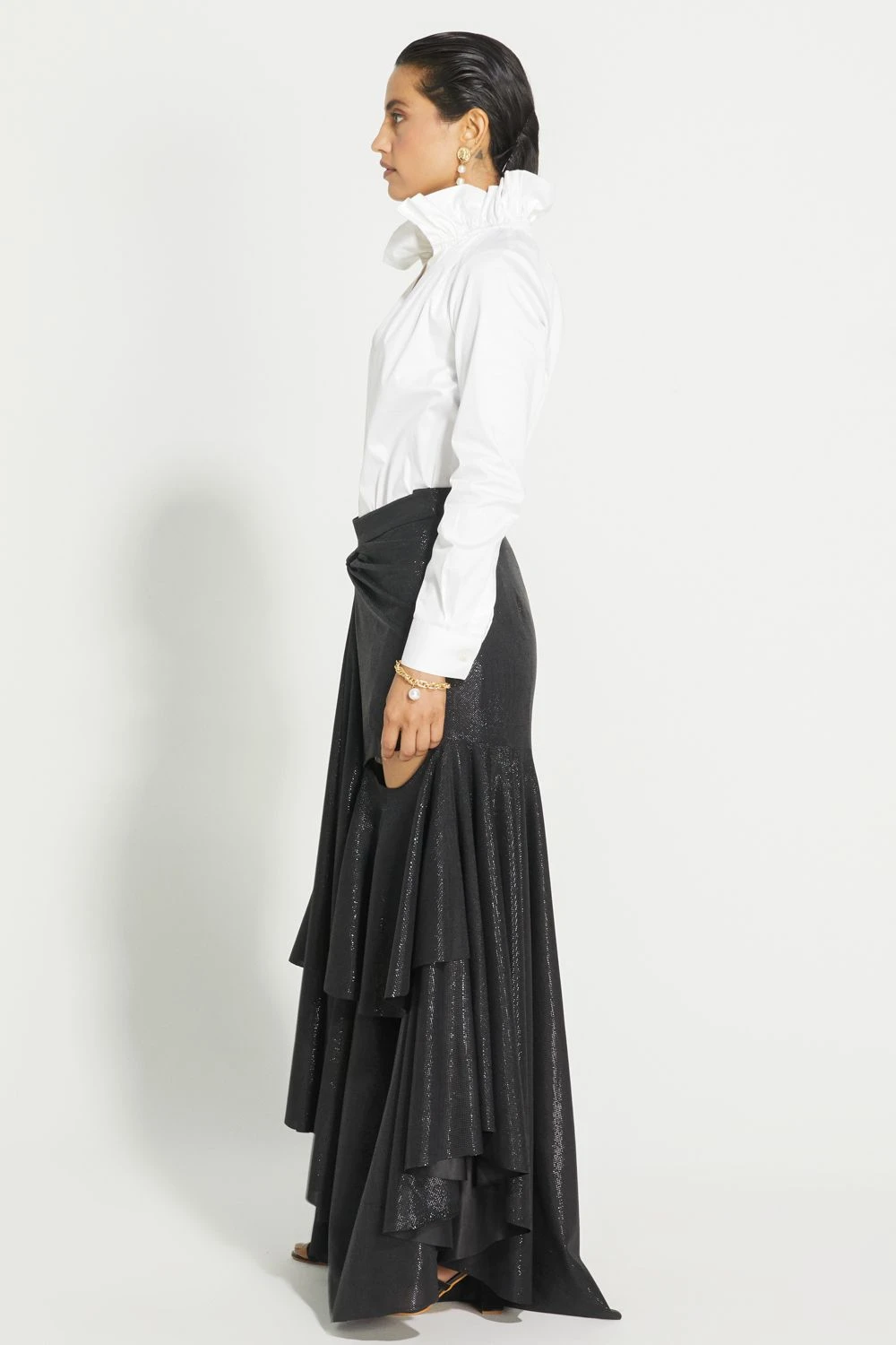 This draped ruffle layered skirt is made in a shimmery jersey fabric with a knot twist detail at the waist. It also features slits on the thigh to add some drama. You can style it with a satin camisole or a shirt from the collection.