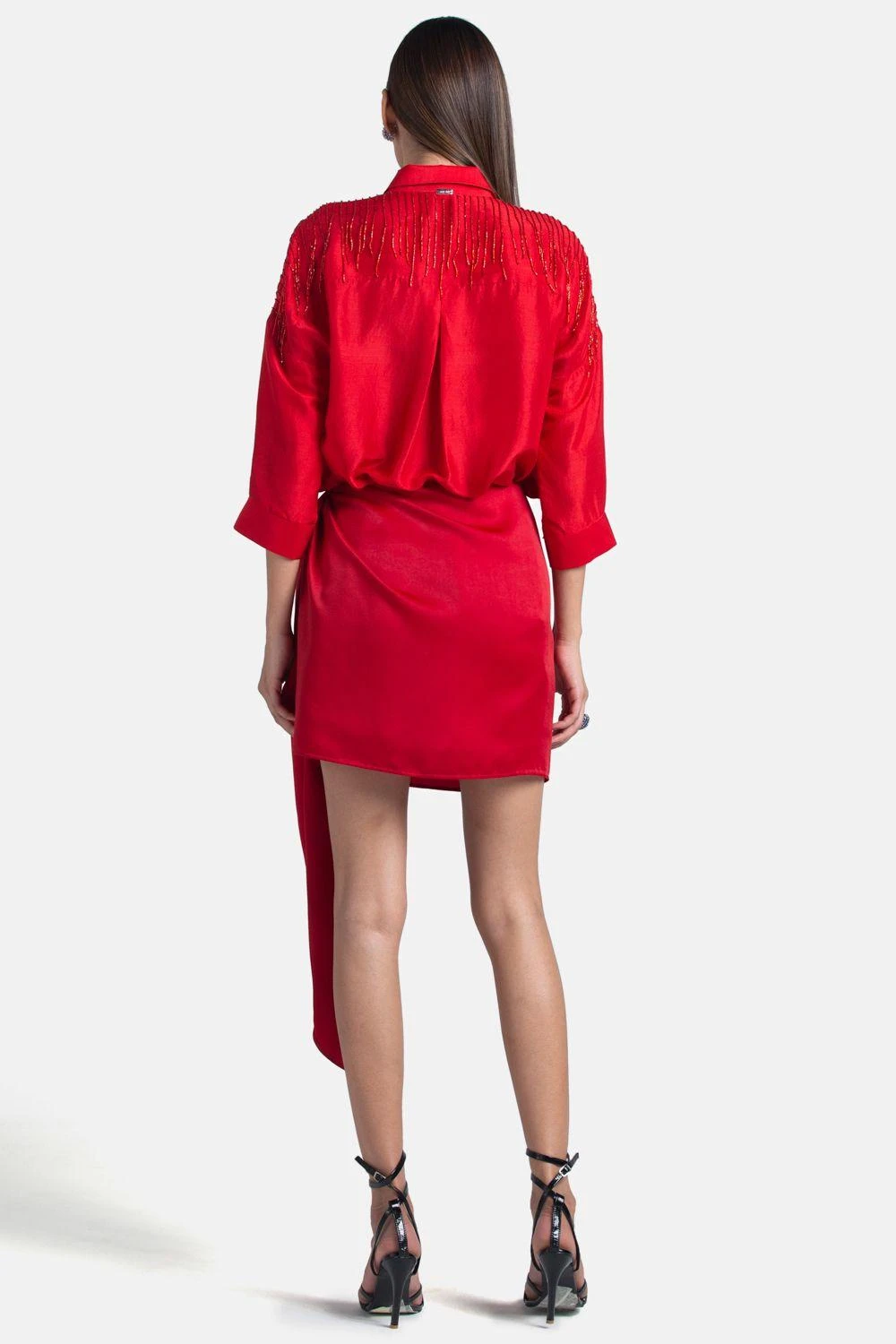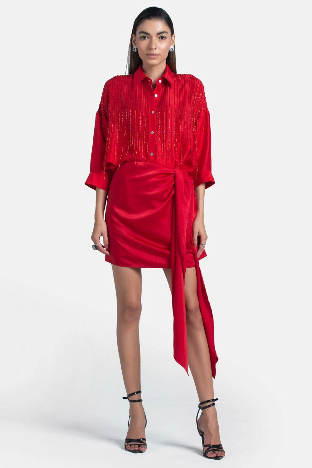 Look efforlessly stylish in this red mini skirt. Cut in satin, it closes on the side with a concealed zip and the features layered fabric knots on top. Style this top with a fringe top for a coordinated look.