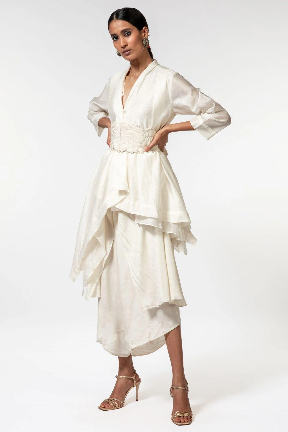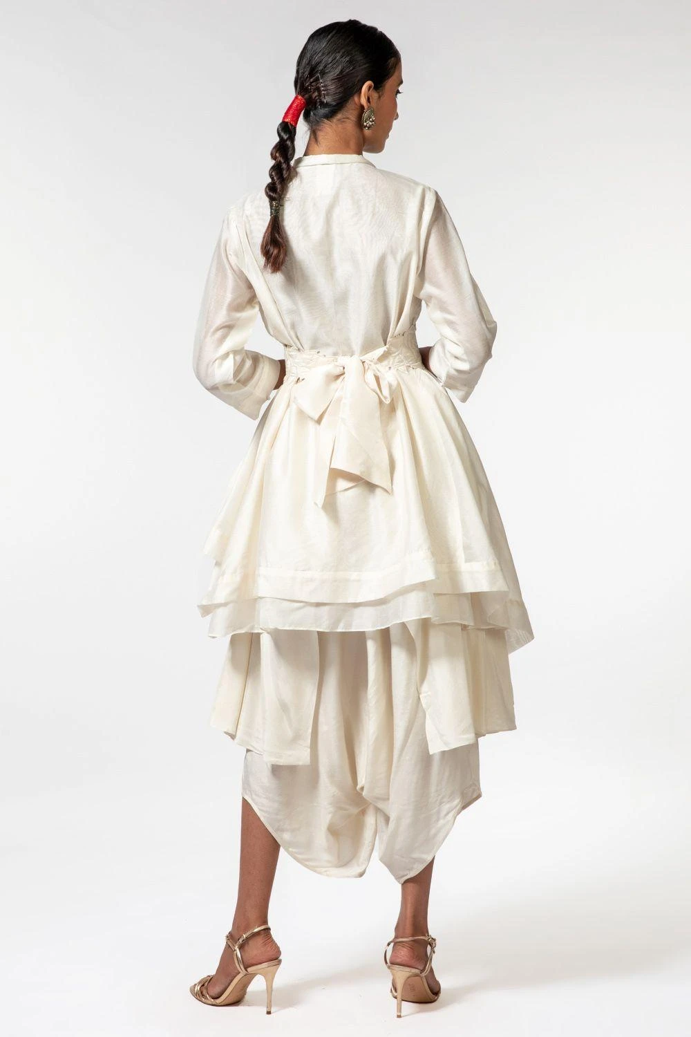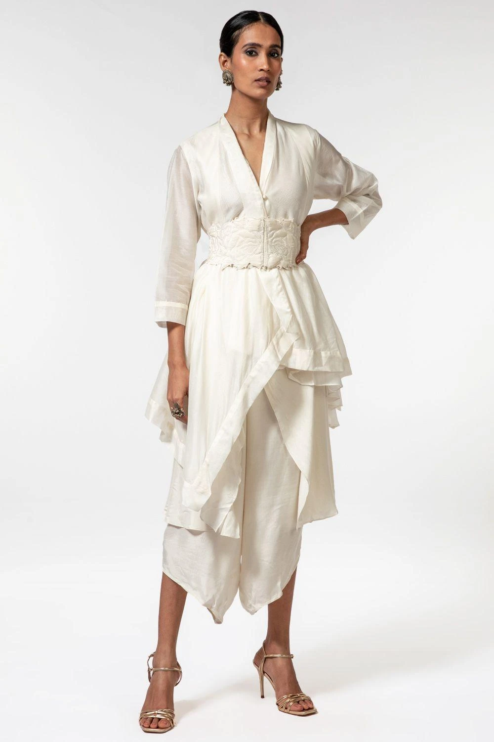 This elegant ivory chanderi asymmetric jacket is worn with Aikeyah’s signature flap pants in shantoon. The jacket is wrapped at the waist with a silk quilted belt with floral motifs. Style this set with a pair of statement danglers & a clutch.