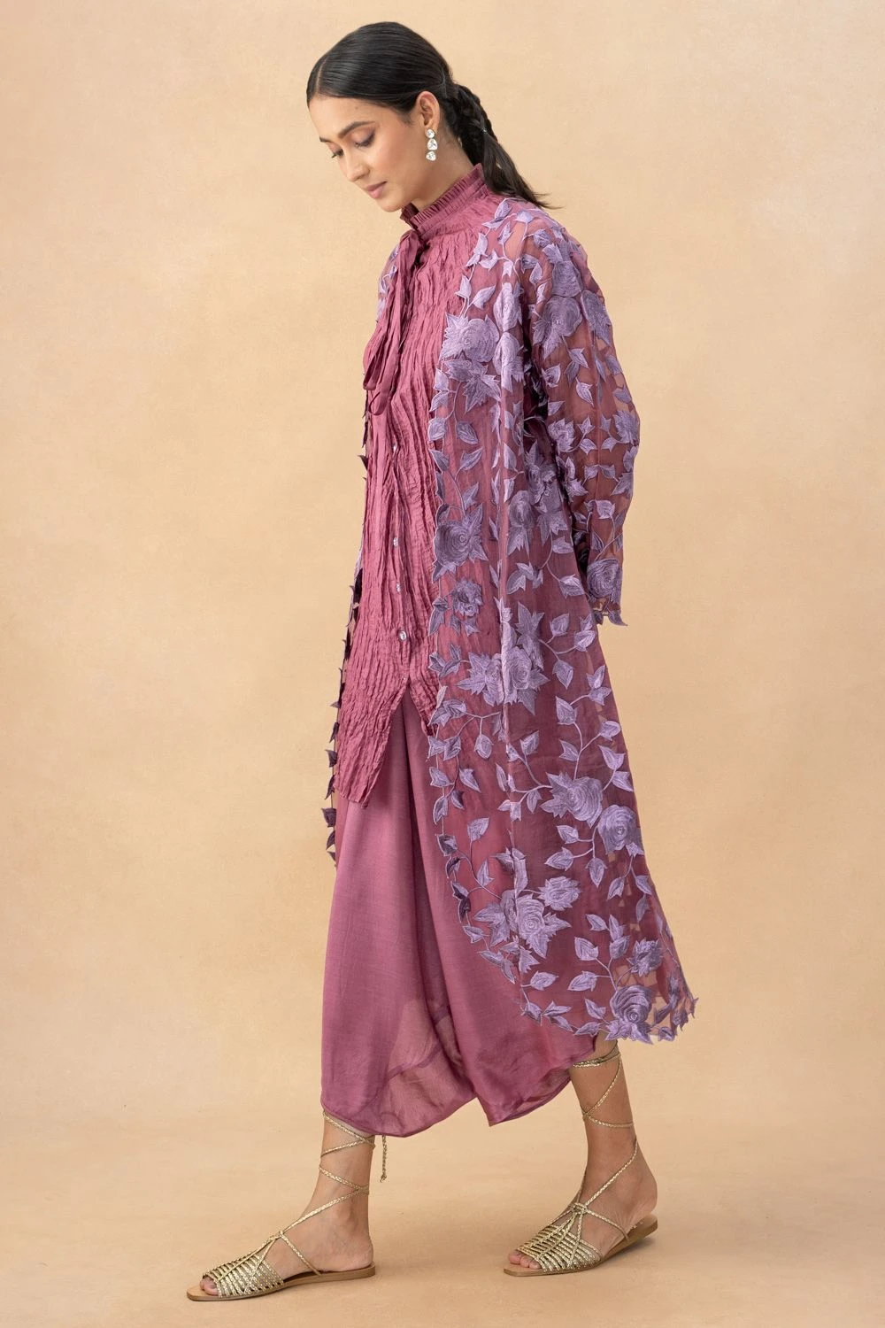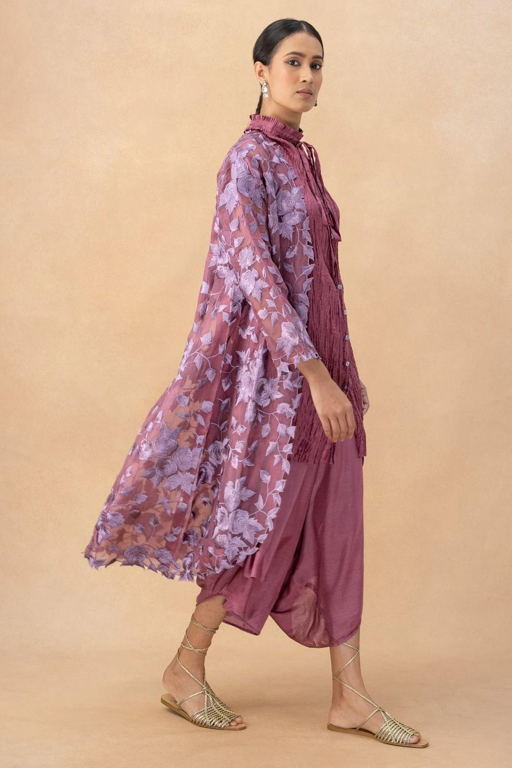This classic monotone embroidered layover is accentuated by the gentle yet striking floral embroidered roses. This sophisticated piece is elegantly paired with a chanderi single button asymmetric top & flap pants.