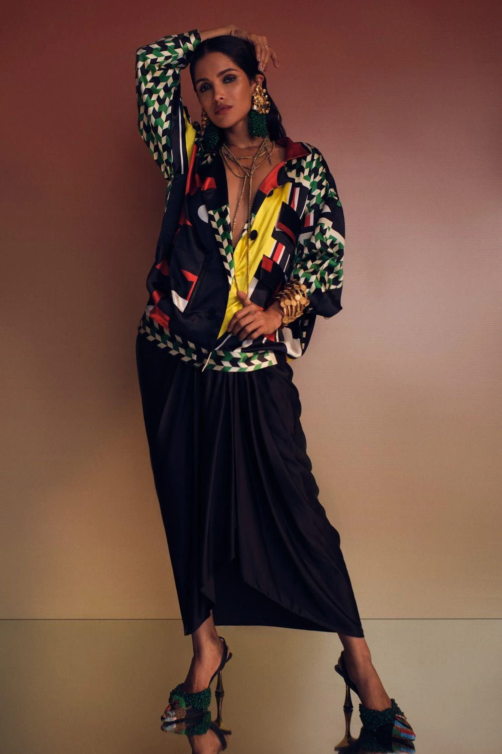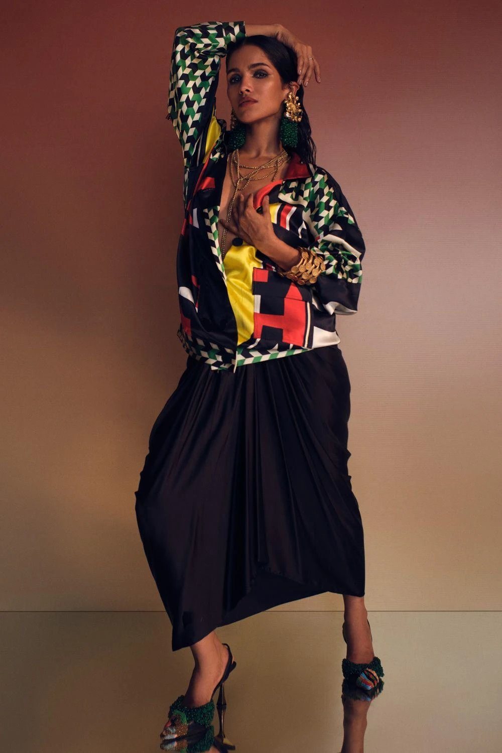 Indulge in chic allure with the Black Geometric Print Silk Jacket. A symphony of elegance, each wear unfolds a story of refined sophisticationùa timeless chapter in your sartorial journey, where style meets substance.