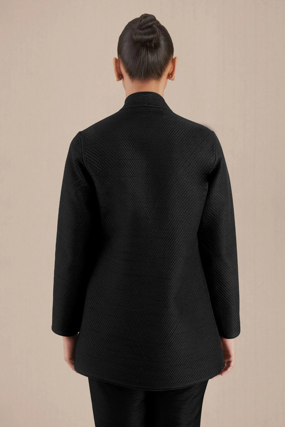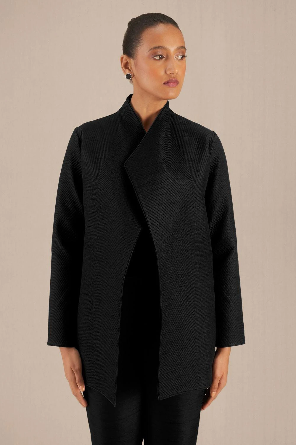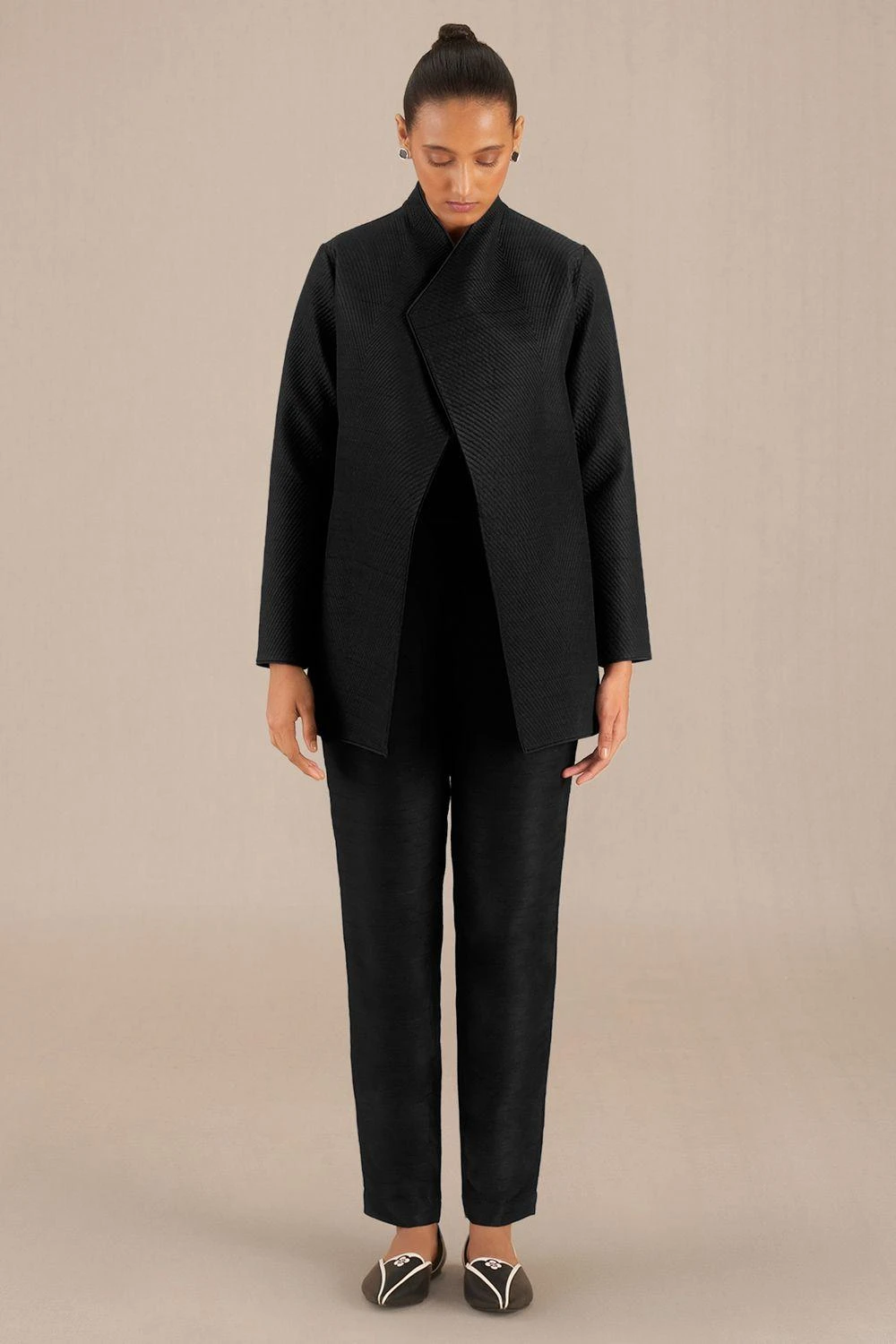Elevate your wardrobe with this Black Sanah Jacket, a harmonious blend of style and comfort. This exquisite ensemble exudes sophistication, making a statement with its captivating design.
