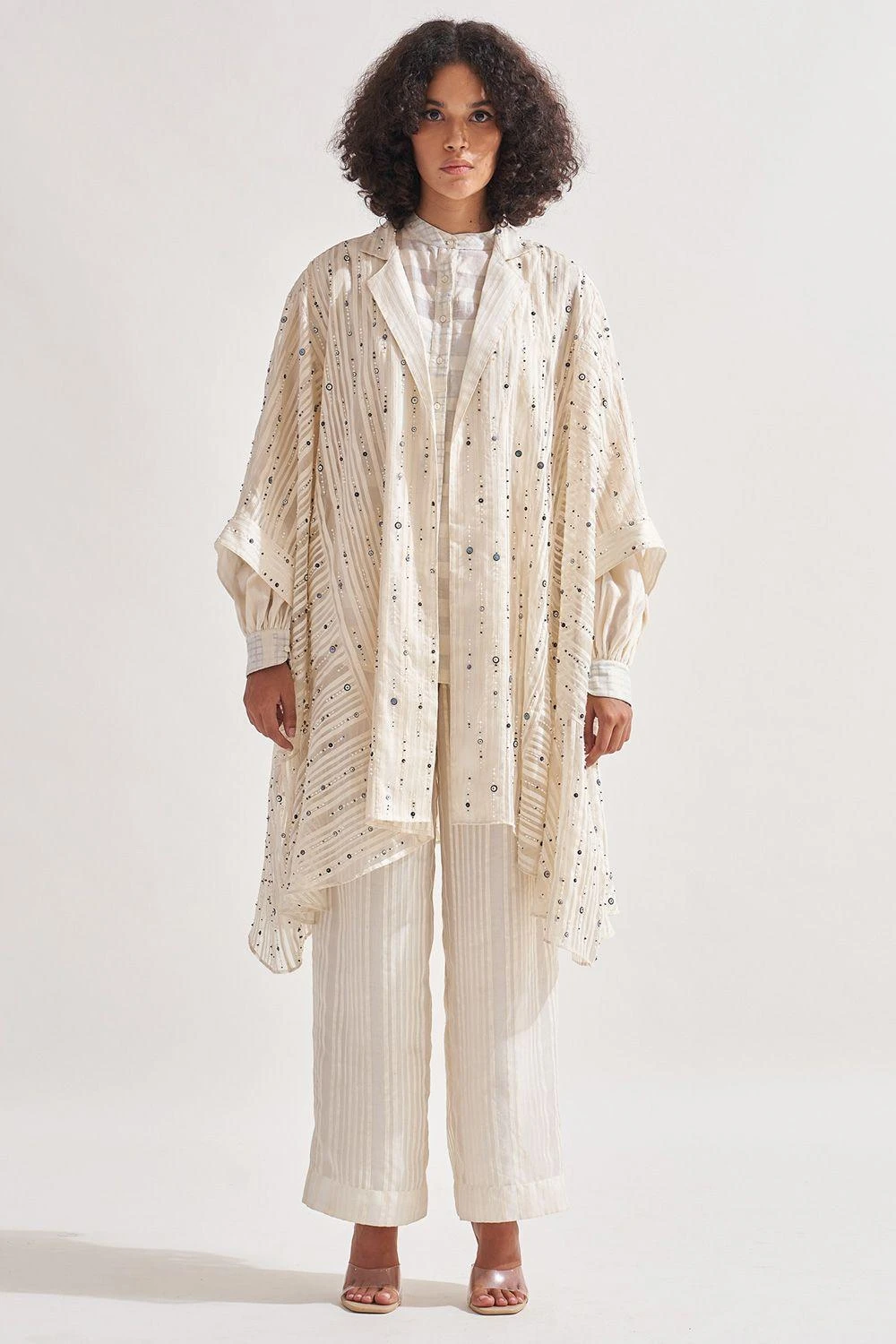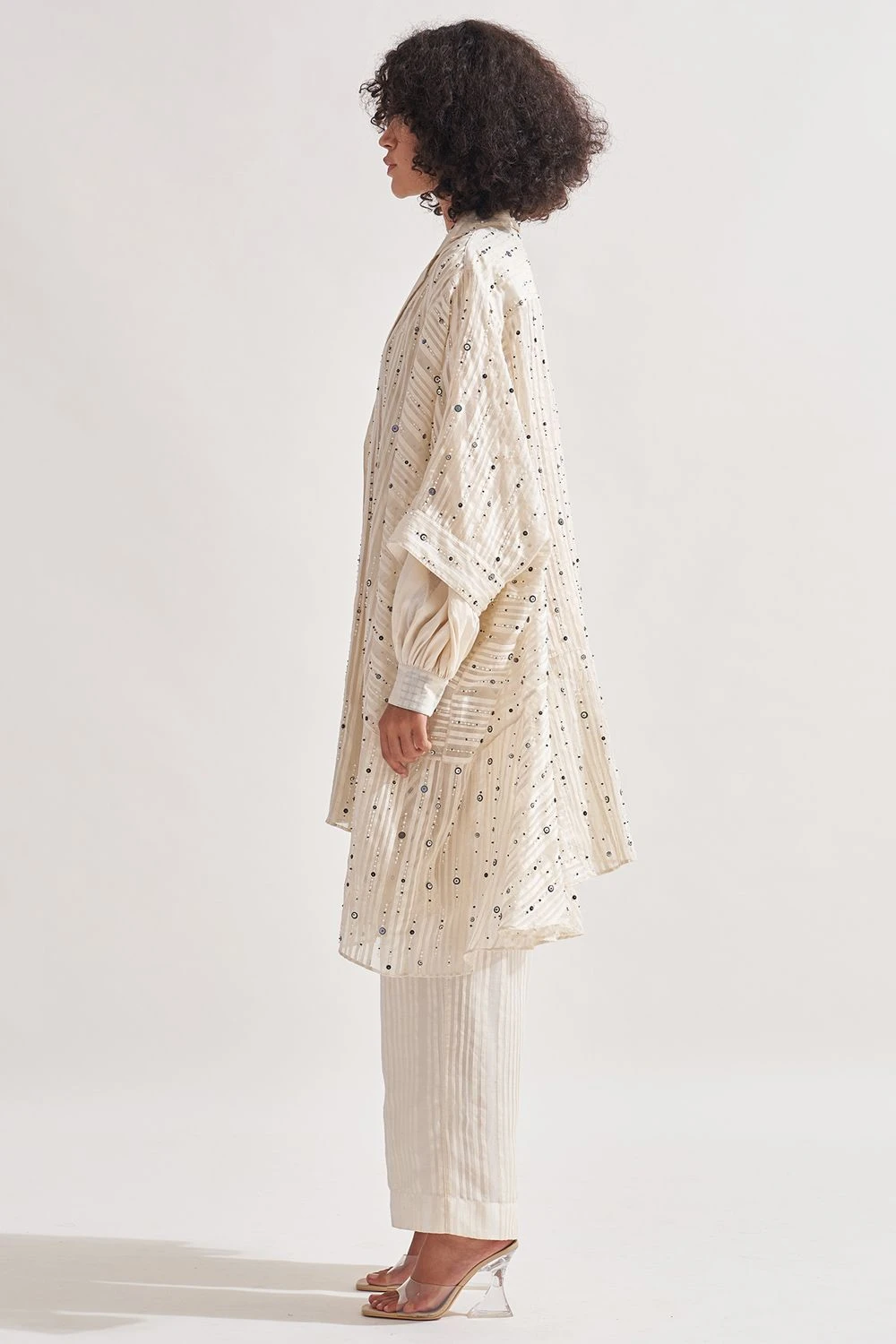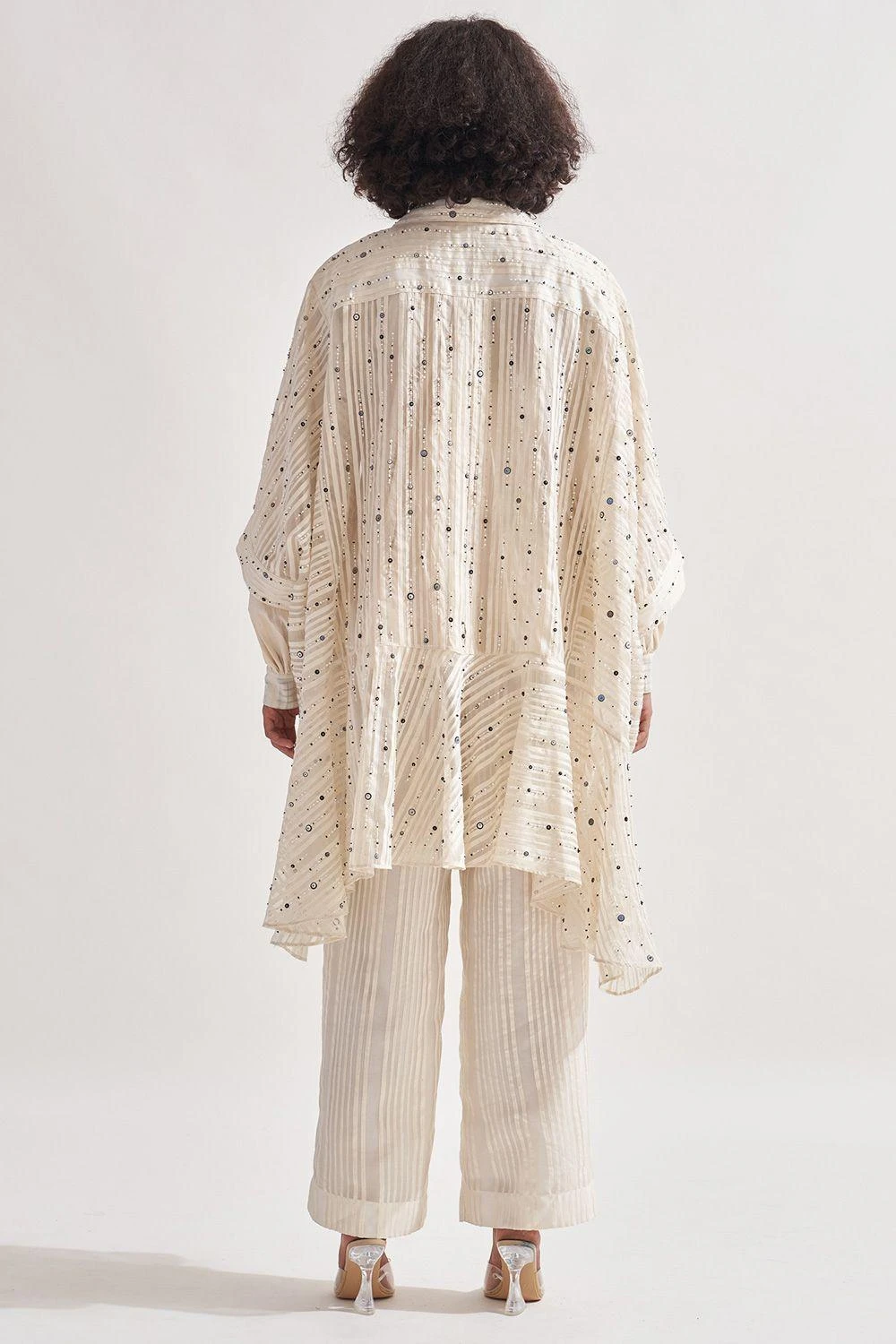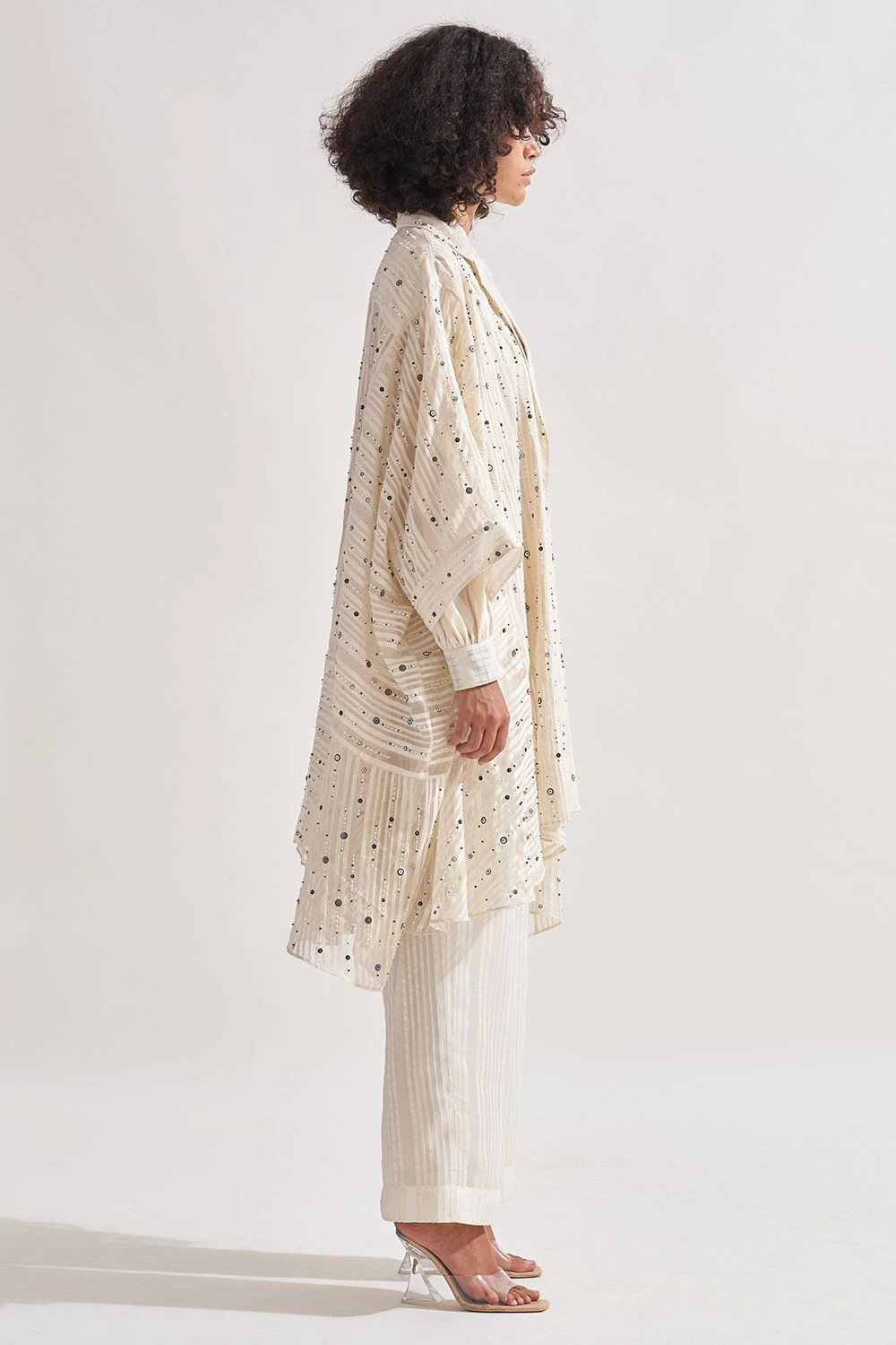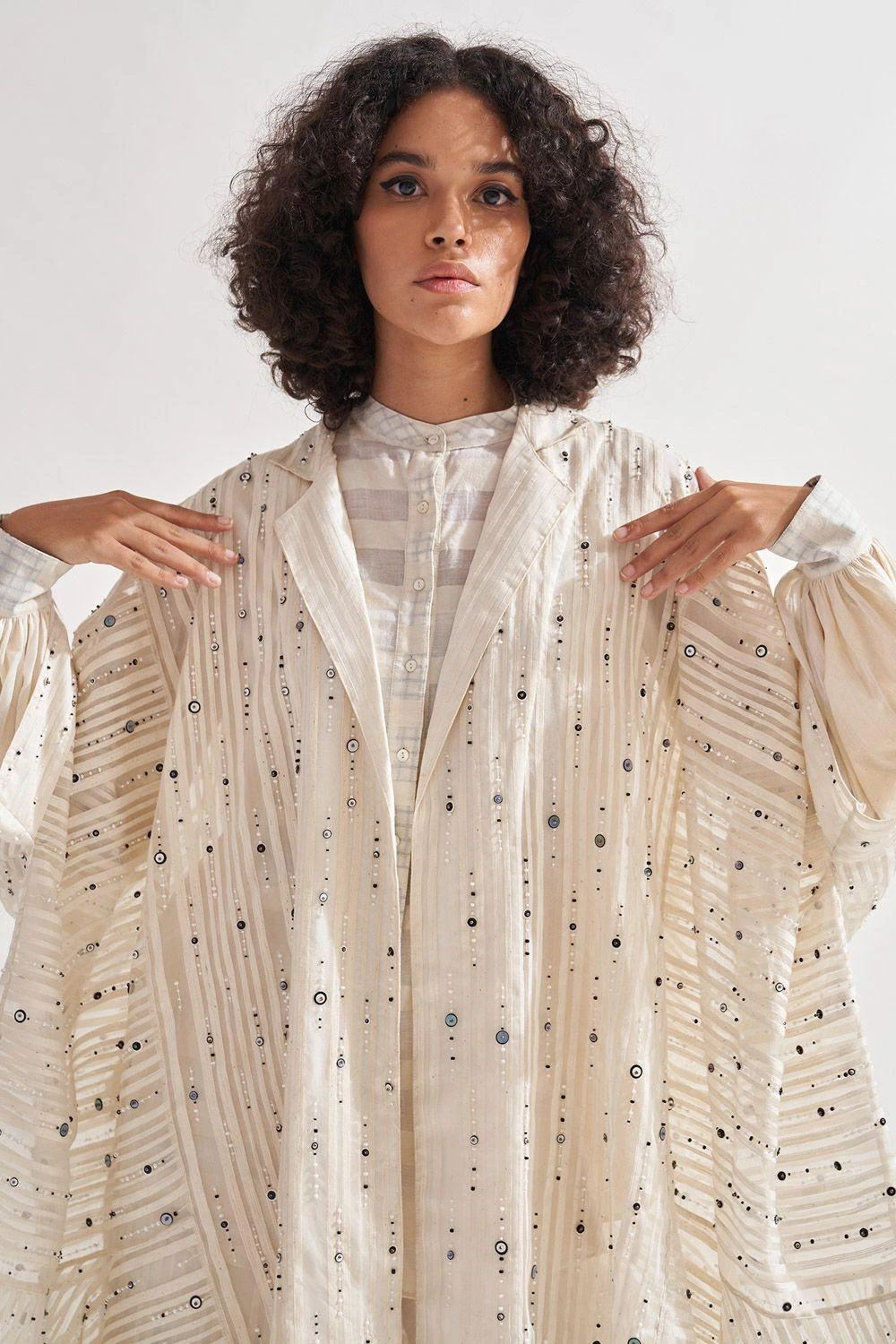 Indulge in the captivating beauty of this stripe panelled overlay. Adorned with intricate hand-embroidered bead and sequin work, it exudes opulence. The 3/4th sleeves add a touch of elegance to this exquisite piece.