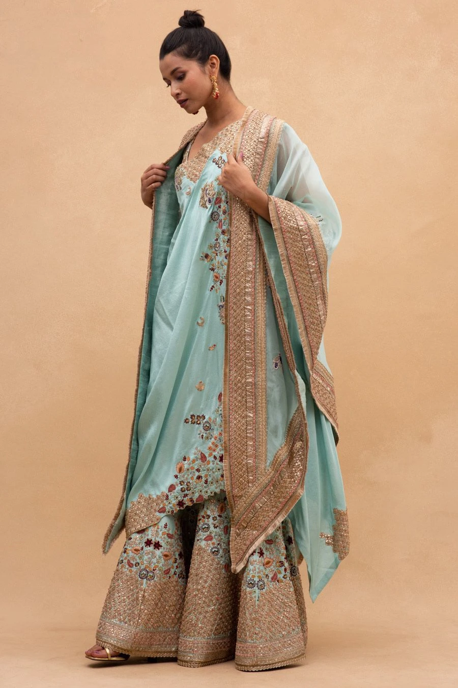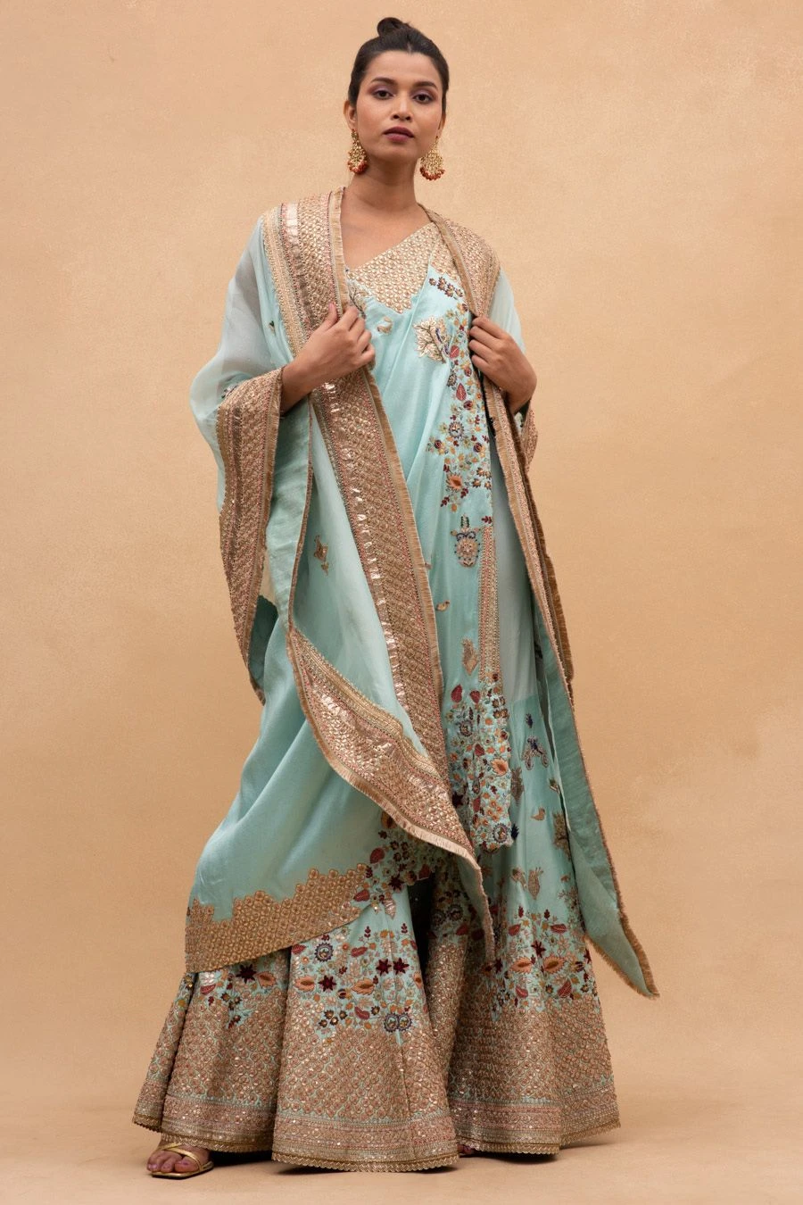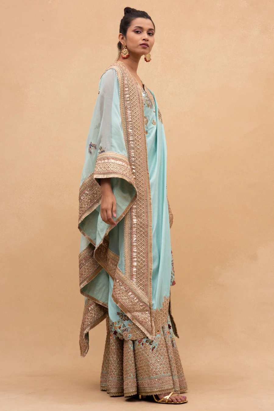 Swap your dupattas for capes this festive season. This set features an embellished cape paired with a one shoulder drape, sharara and a bustier. Style this set with a pair of statement earrings & a clutch to complete the look.