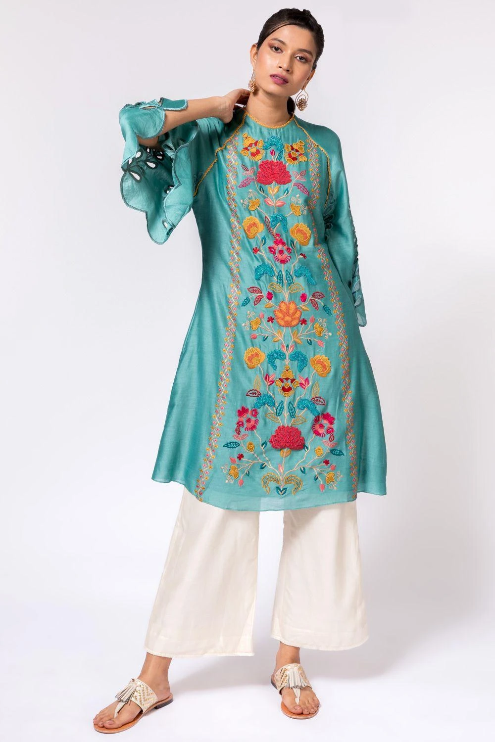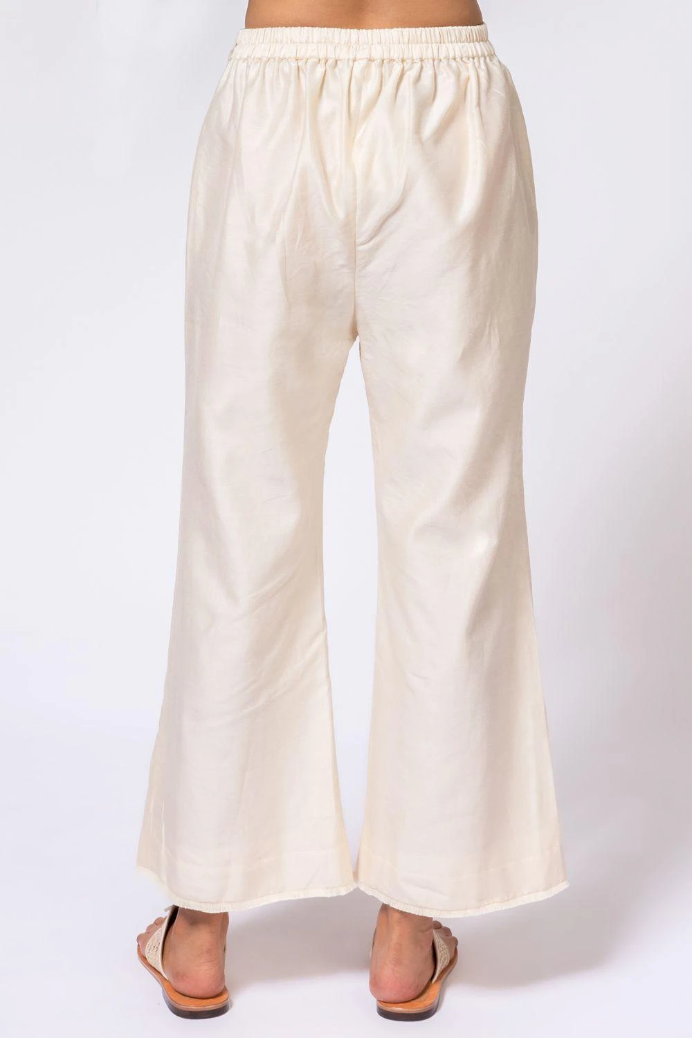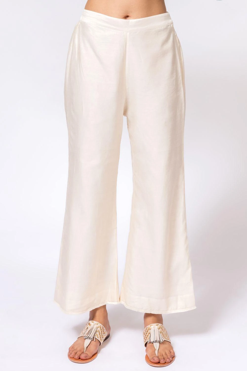 These gently flared ivory pants are cut in chanderi fabric in a comfy fit. This versatile pair can be styled with an array of options from your closet.