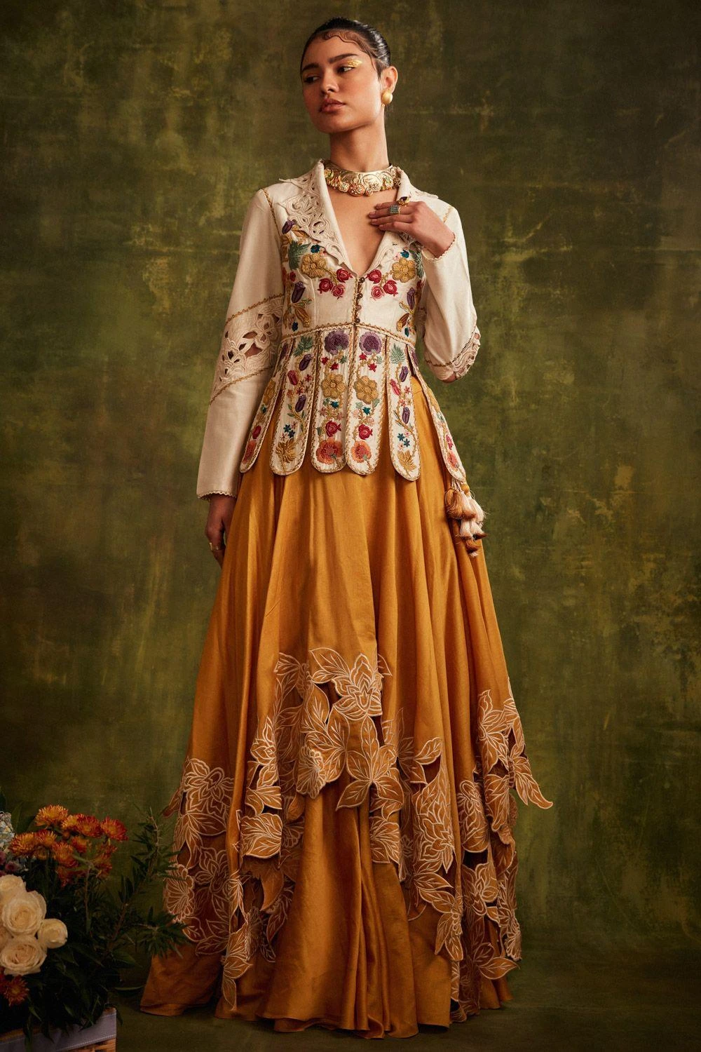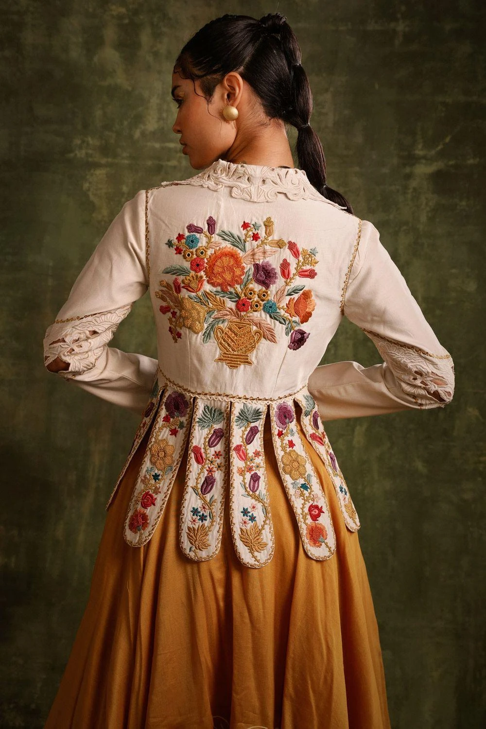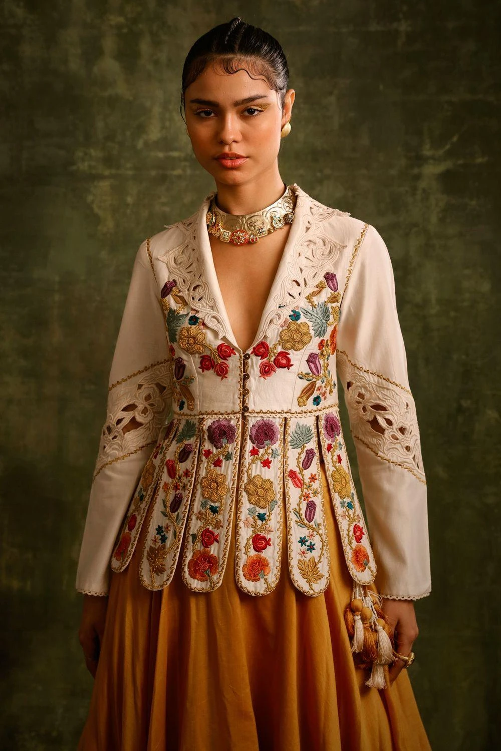 This statement ivory panelled jacket is adorned with colourful floral threadwork. Style this over a lehenga or trousers for a festive daytime look.