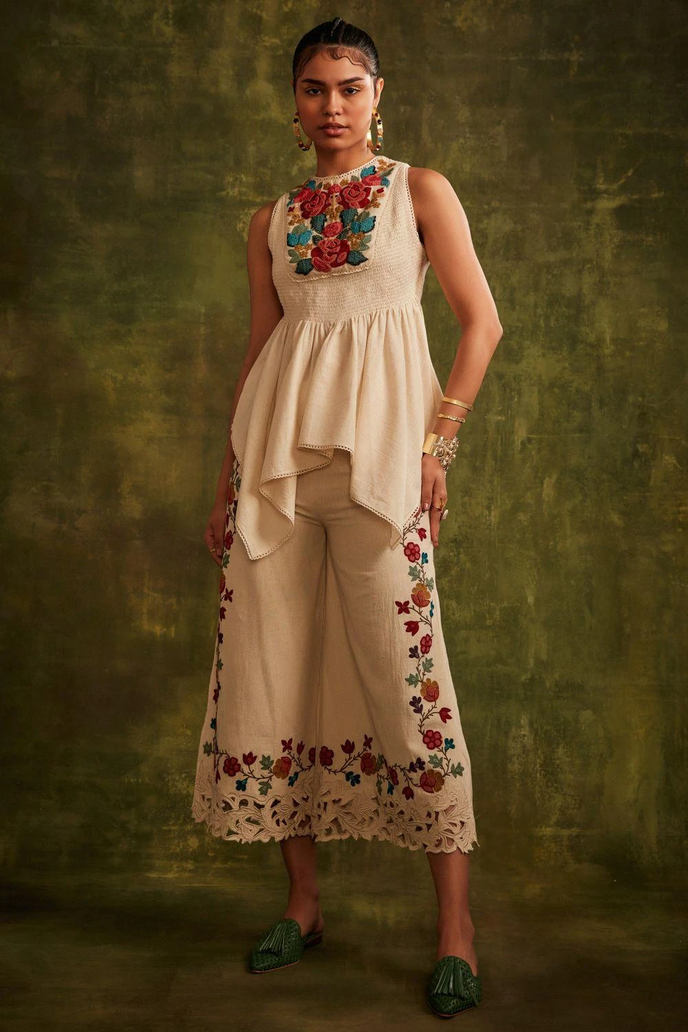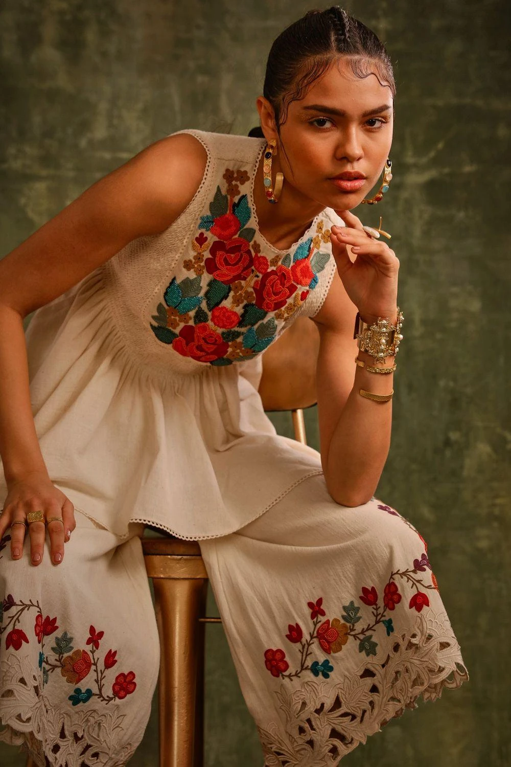 These playful ivory kala cotton pants are highlighted with colourful floral beadwork & cutwork. Style this unique piece with a tunic or top for daytime events.