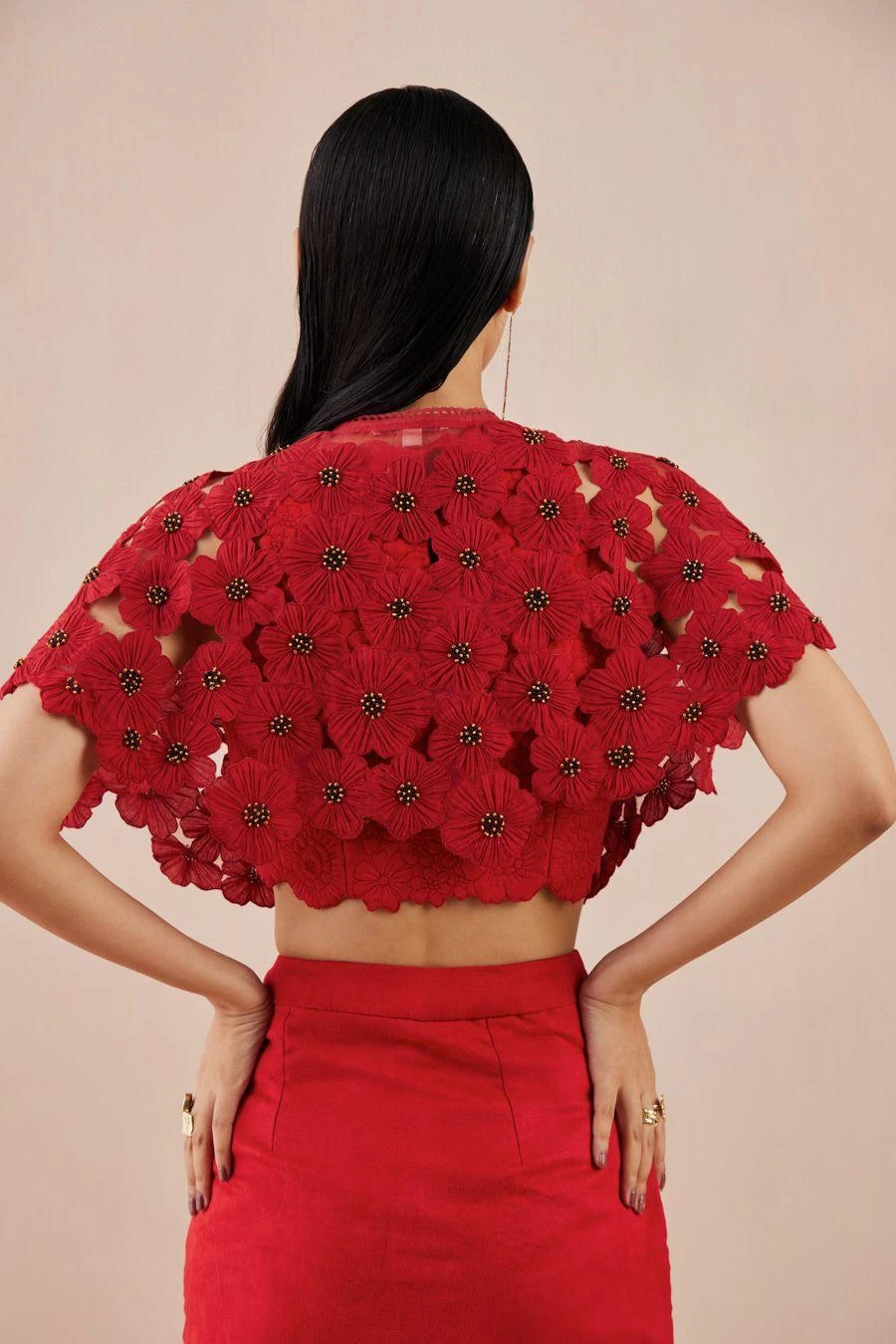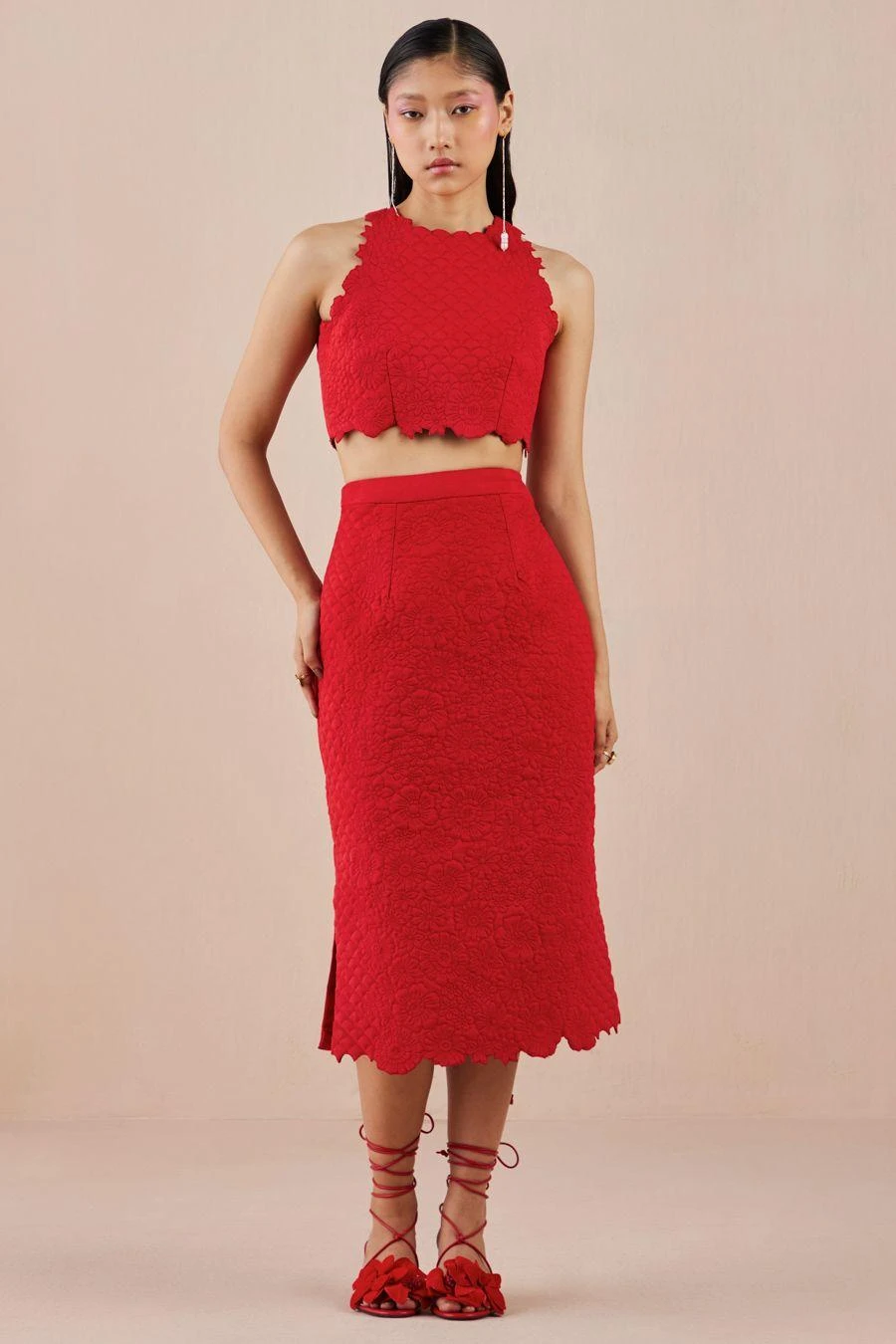 Add a layer of statement & glamour to your resort getaways with this skirt. Crafted in faux suede, this floral & geometric quilted pencil skirt features cutwork details. Pair it with the Red quilted crop top from the collection to complete the set.