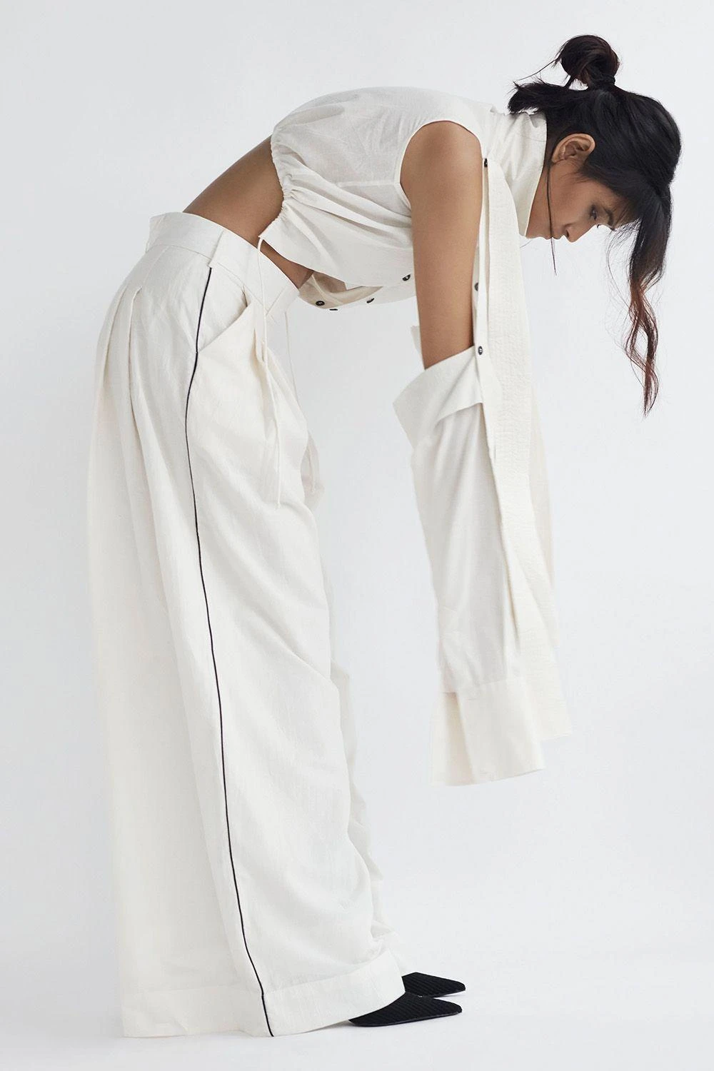 Cut in cotton these white trousers feature side pockets, pleats at the front and back, piping details at the sides and a belt. Pair these with a matching white crop shirt to complete the look.