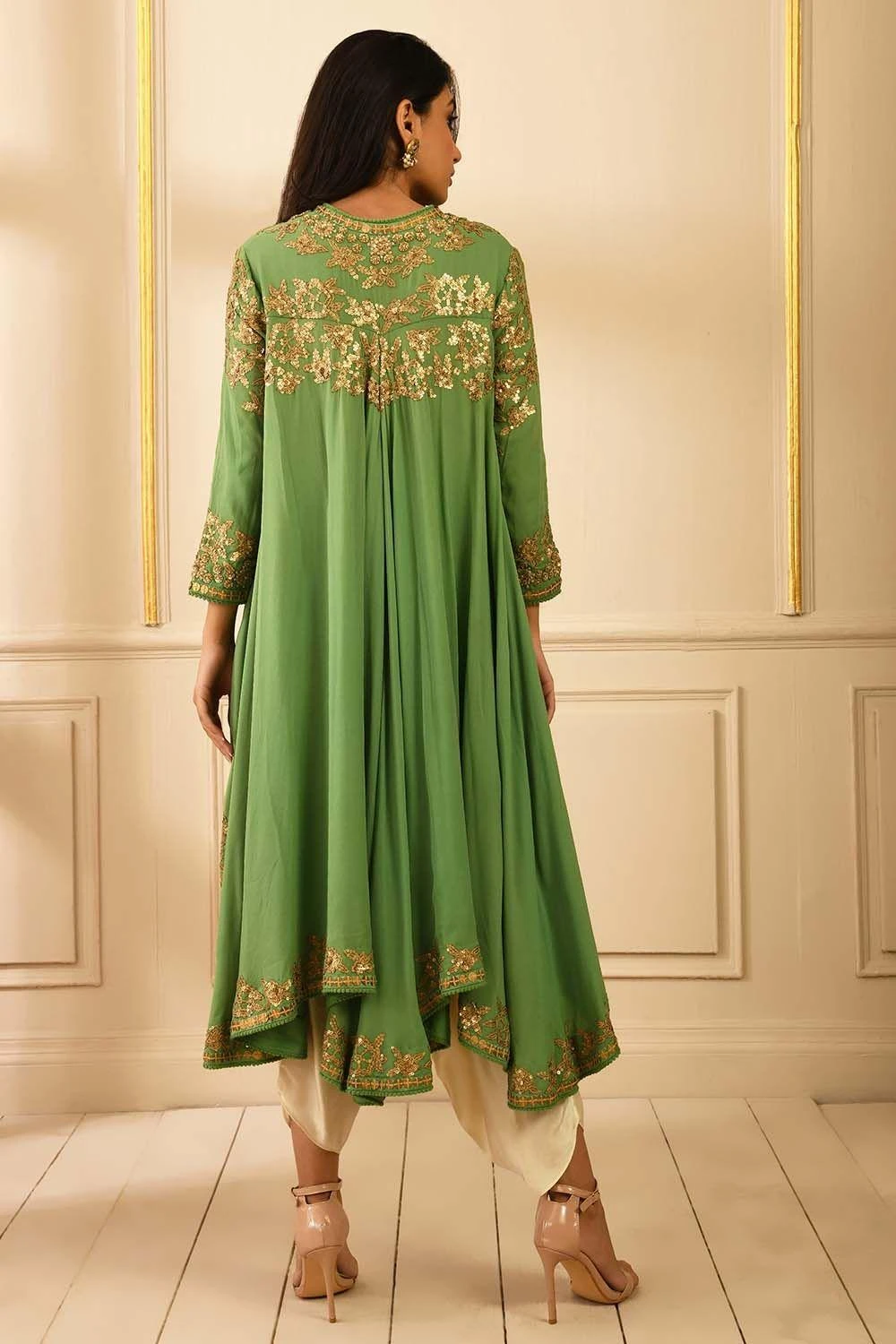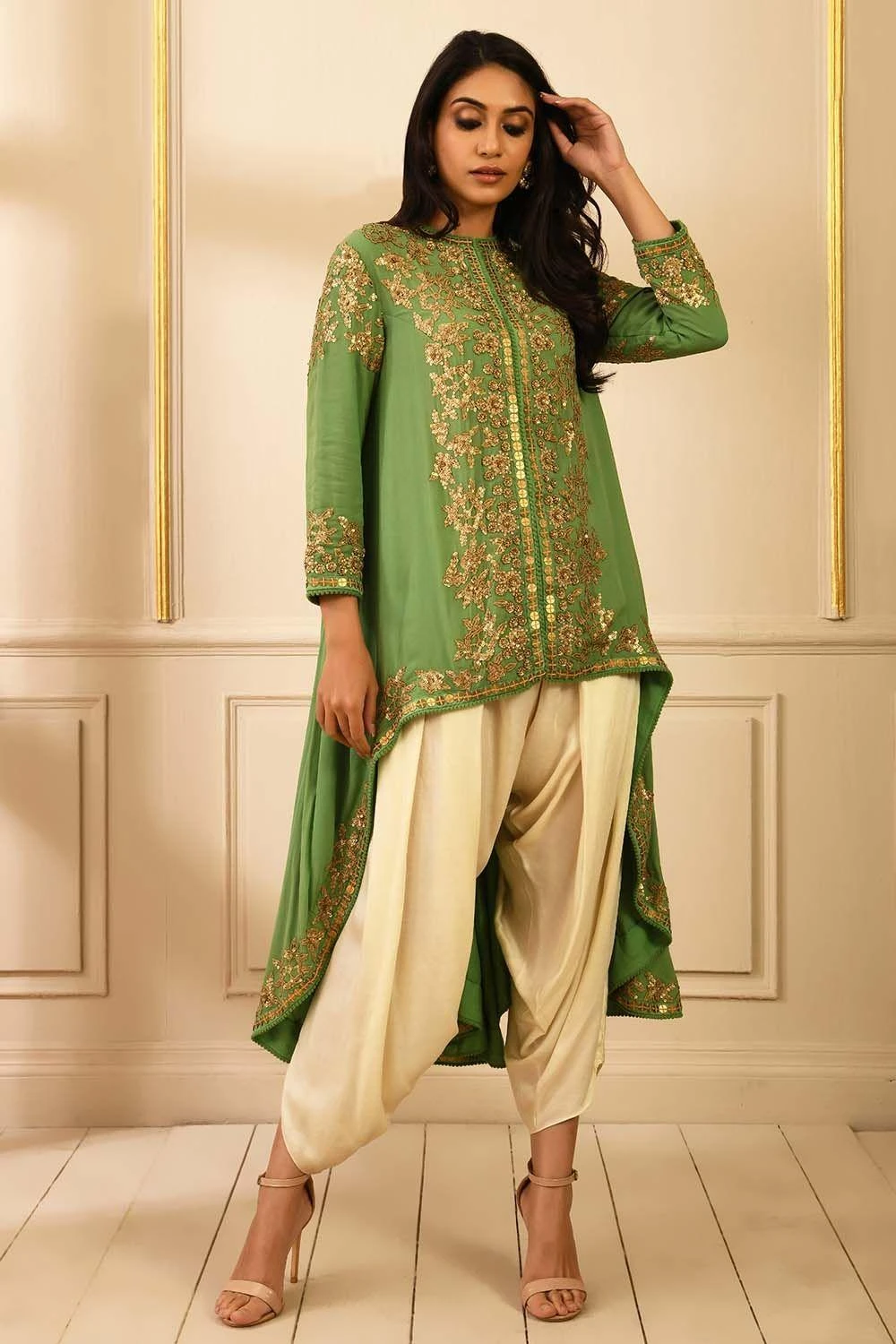 This elegant mehendi green high low jacket is adorned with sequin embroidery & gold zari embroidery. It is paired with classic beige dhoti pants. This effortless look is perfect for destination wedding functions.
