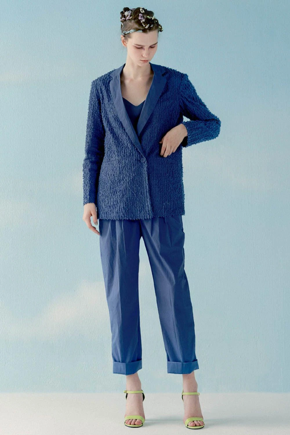 Give any look a fashionable spin by layering it with this blue jacket. Cut in poplin, this jacket features thread work embroidery. Style this exquisite piece the blue poplin pants to complete the look.