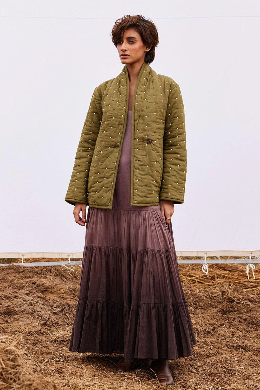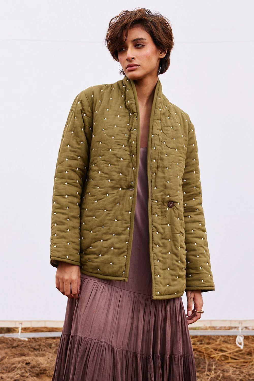Indulge in style with the wasabi green quilted jacket. Featuring a shawl collar, front button opening, wasabi green & white shibori lining and side welt pockets, it’s practical sophistication.