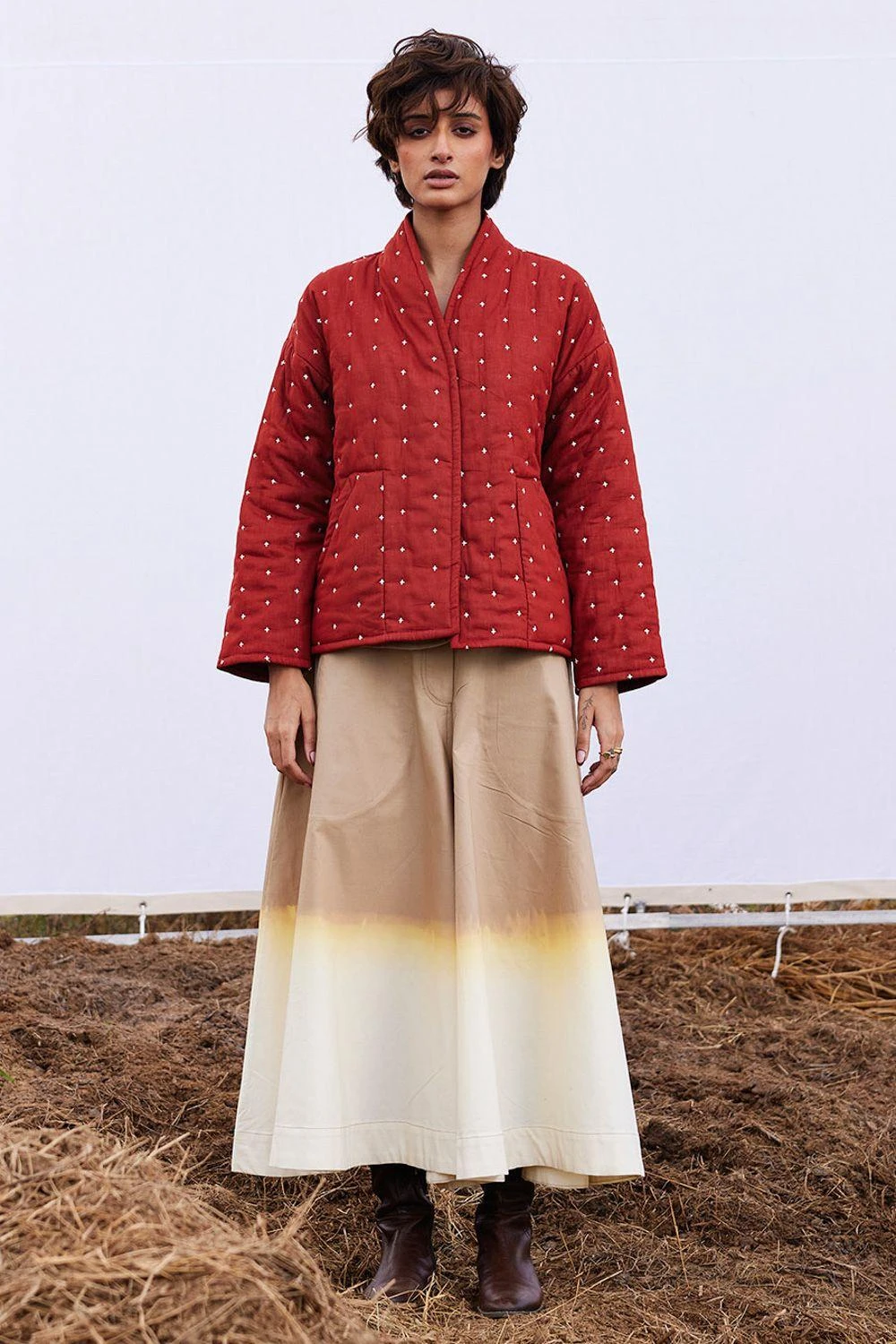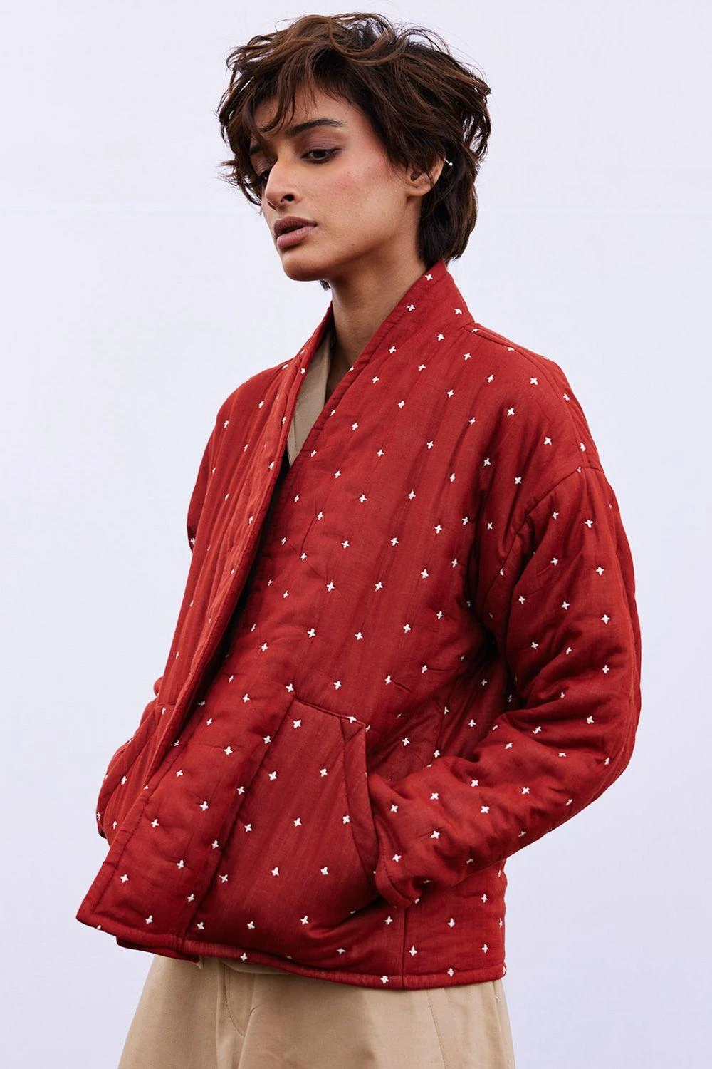 Make a statement in this brick red quilted jacket. Designed with a built-up neckline, full sleeve detail and convenient front pockets, it’s timeless elegance redefined.
