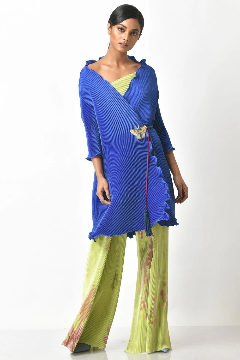This eclectic indigo wrap is woven in a pleated polyester mix and is adorned with a blingy butterfly motif. This piece is perfect for a daytime soiree. You can style it with a pair of wide leg pants & statement choker to complete this look.