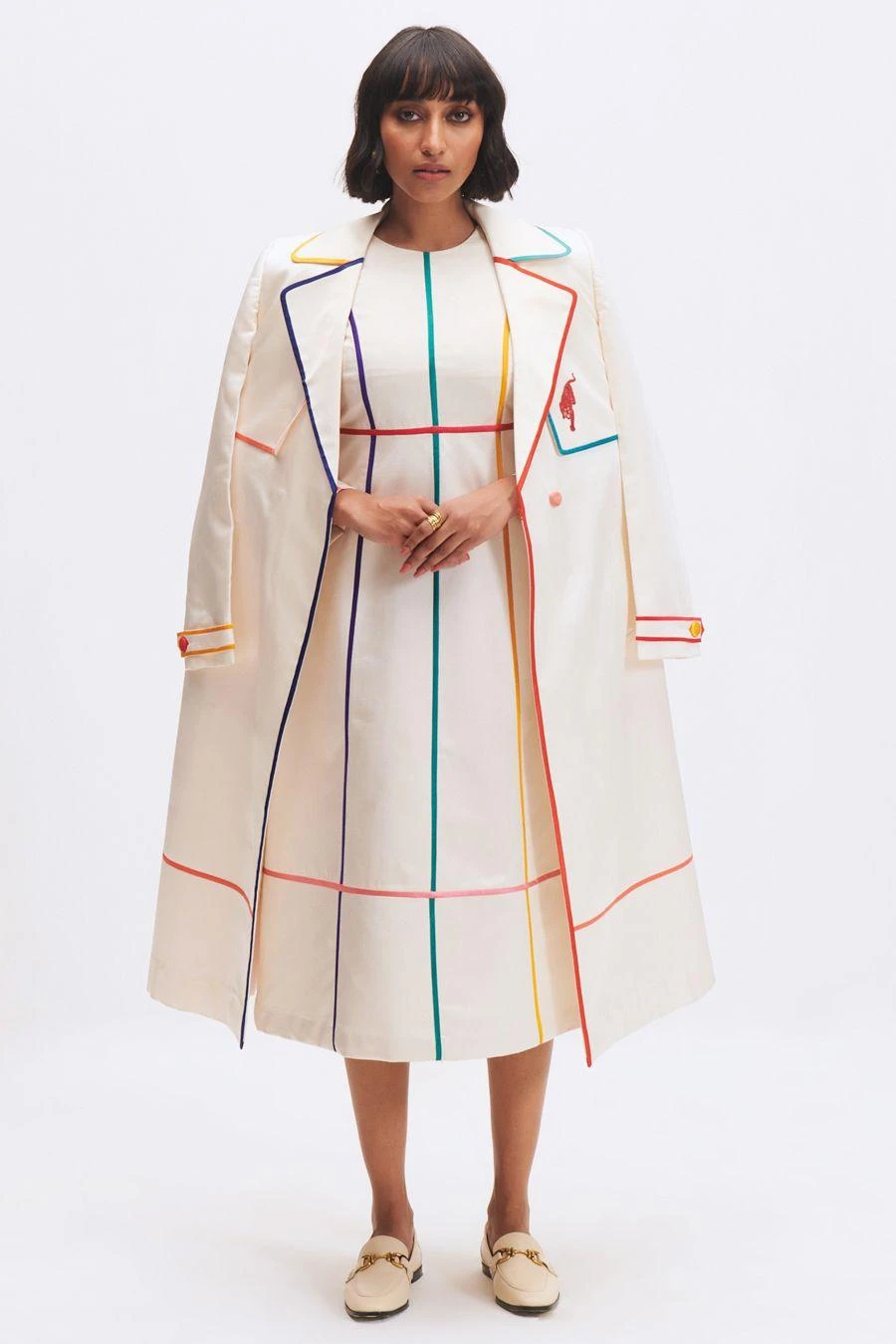 Indulge in the epitome of effortless sophistication with the Striped Trench Coat crafted from the finest silk satin crepe. The structured silhouette of the trench is complemented by embellished details