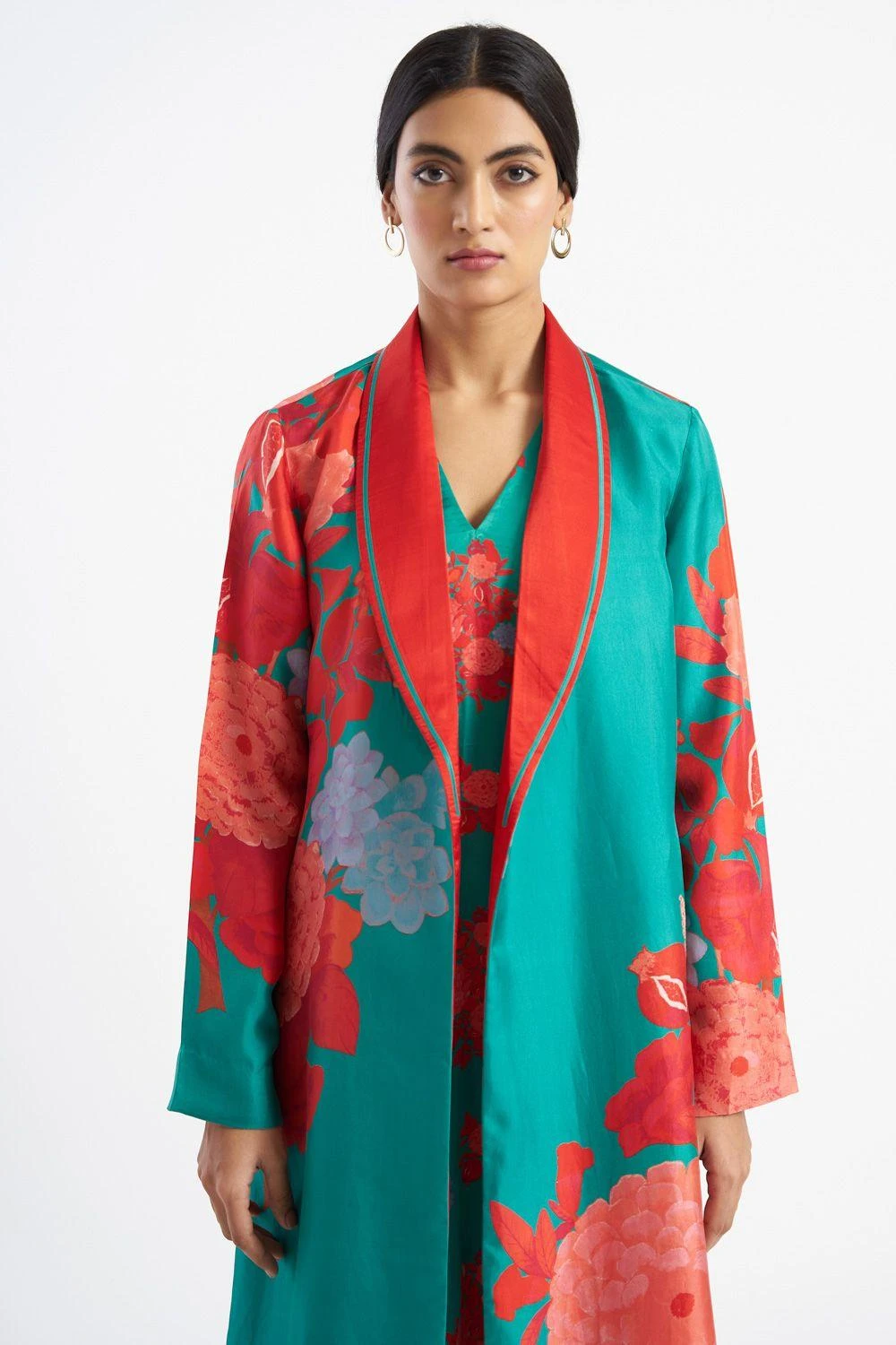 A statement jacket is one of the must haves for every closet. Ditch those basic ones and go for this Nahar robe jacket. It is woven in silk twill with florals printed in vibrant ruby on a jade base.