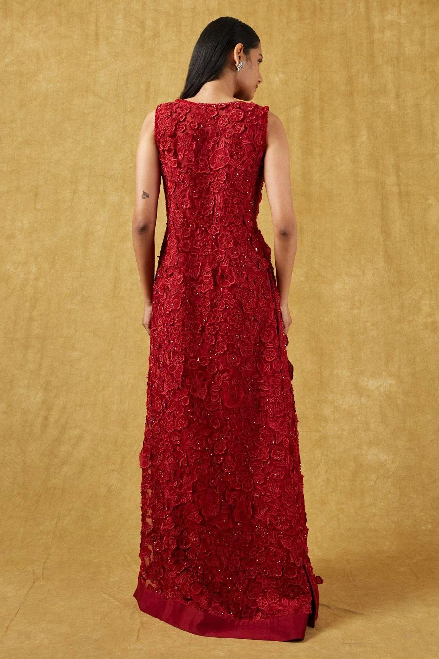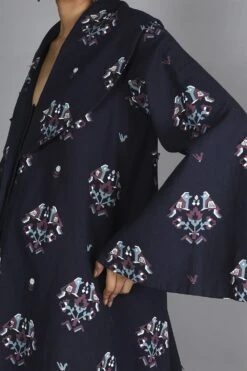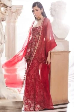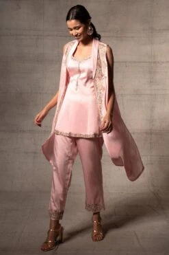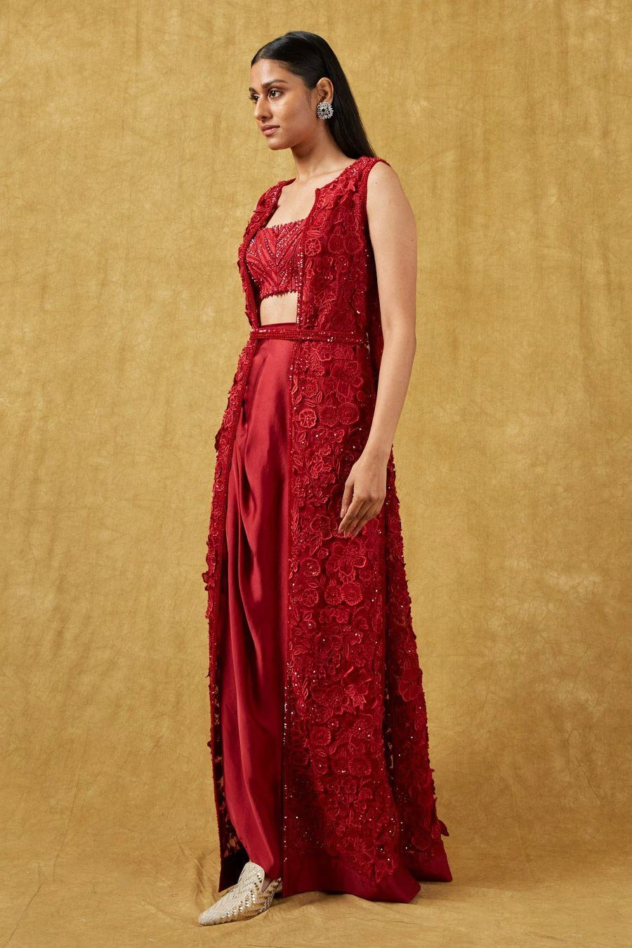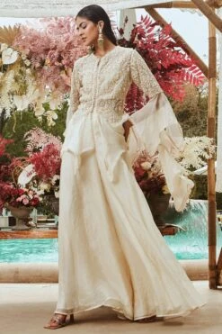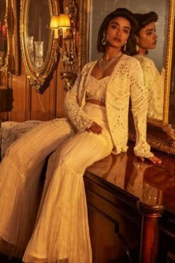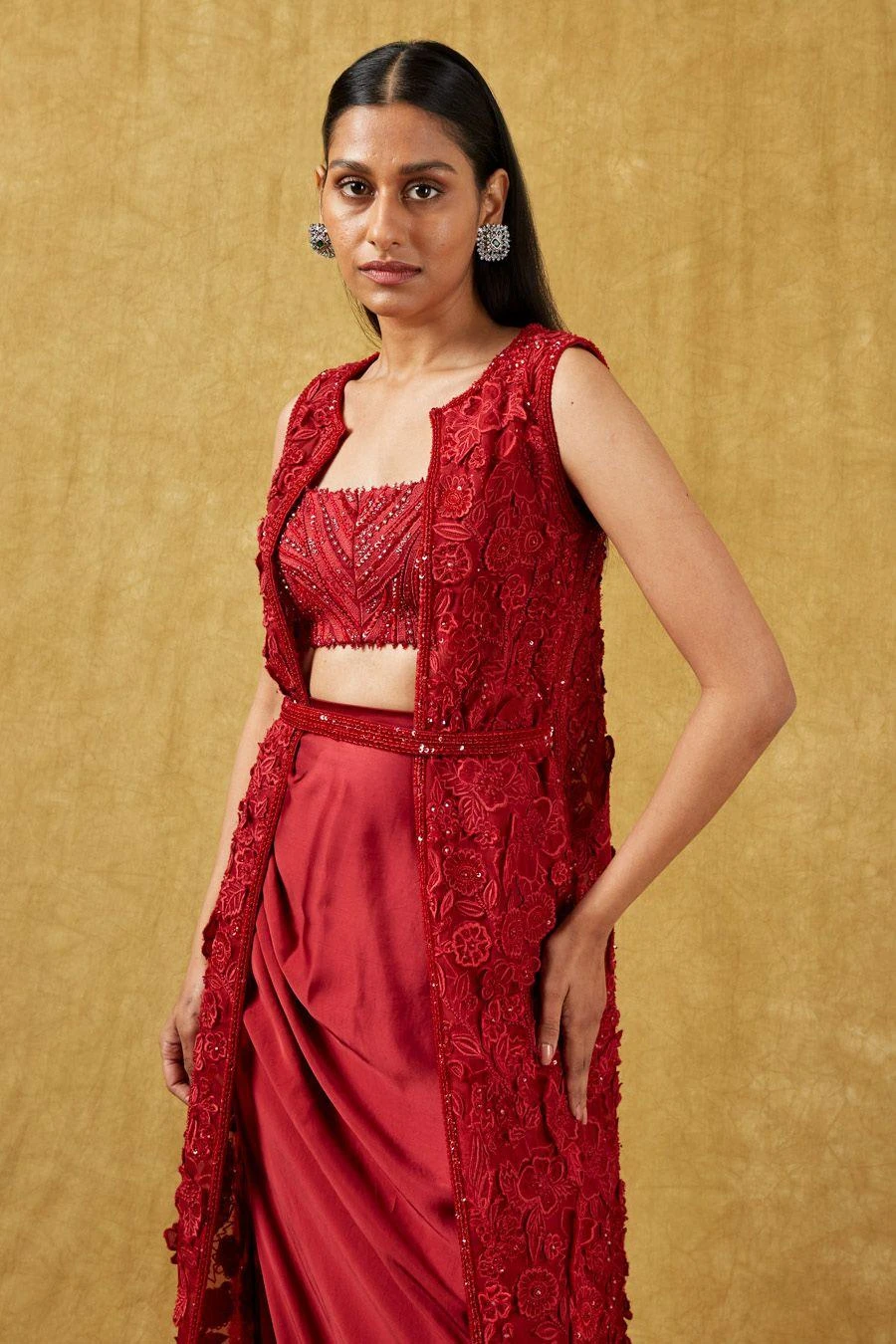 The perfect amalgamation of style and comfort, this jacket set works across occasions. This set features a 3-D embroidered jacket paired with a bustier and a draped skirt. Add a pair of statement earrings to complete the look.