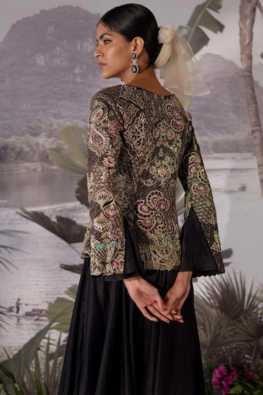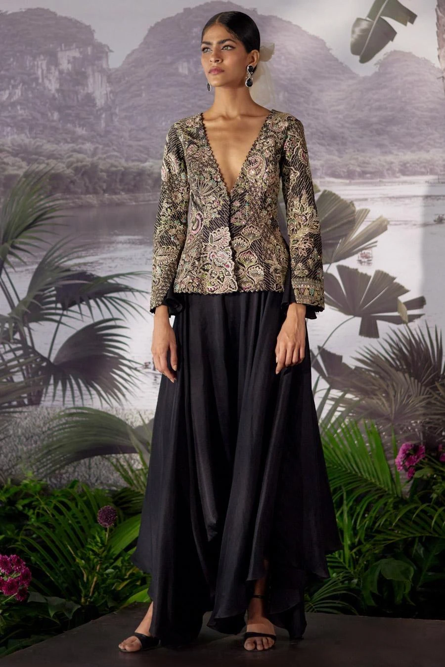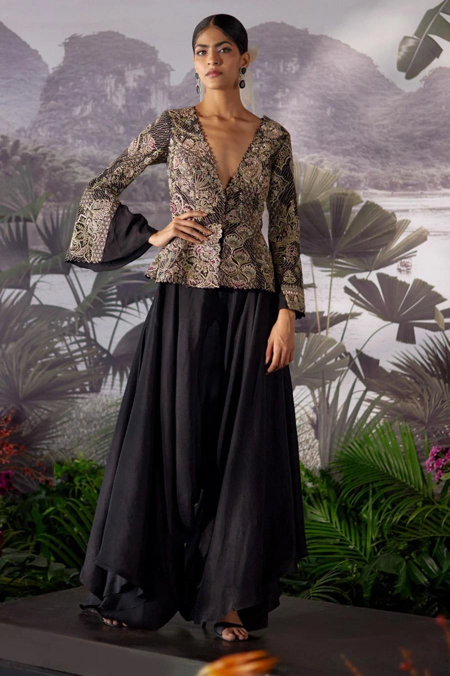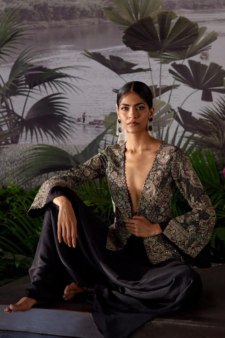 Swap your dupattas for jackets this wedding season. Crafted in silk, this set features a hand embroidered jacket paired with flared pants and a blouse. Add a pair of statement earrings & a potli to complete the look.