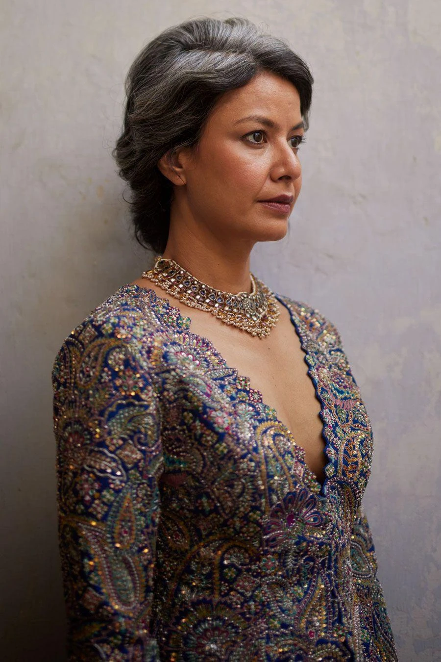 Indulge in the captivating allure of this exquisite ensemble, featuring a Paisley jacket with resham & zardozi embroidery. Complementing the jacket are uneven flared pants & a textured sleeveless blouse.