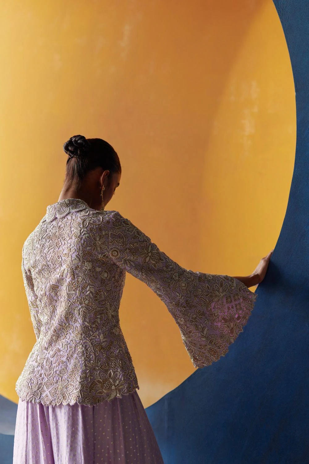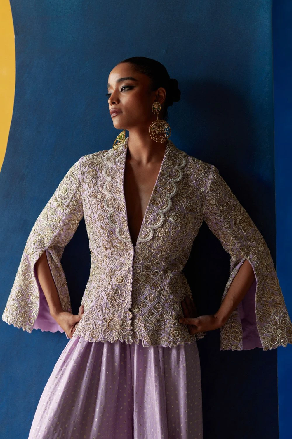 Elevate your style with this lilac shawl collar jacket, adorned in intricate off-white resham, pearl, and zardozi embroidery. It is paired seamlessly with coordinating lilac gathered palazzo pants.
