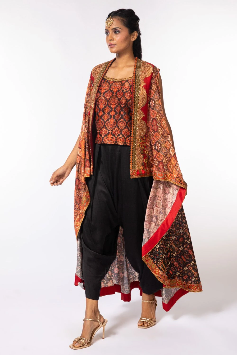 Amp up your ethnic closet with young fusion pieces from Debyani. Featuring a printed top & drape cowl black pants accentuated with an asymmetric embroidered jacket. Style this whimsical set with a delicate choker for an evening festivity.