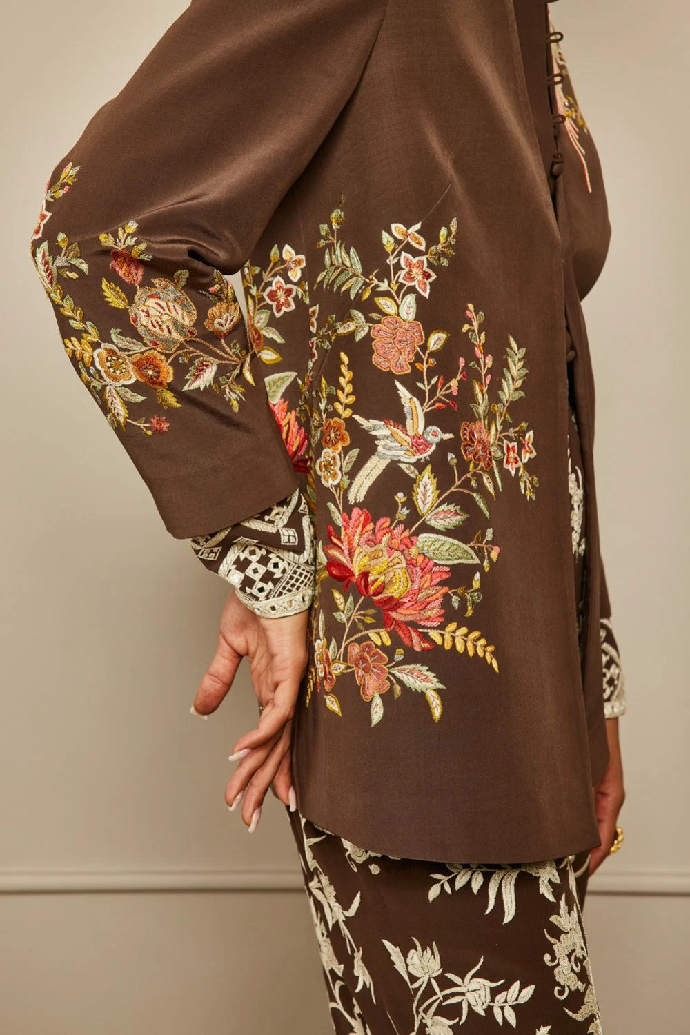 This mouse grey vivian jacket is a modern day heirloom piece. It is cut in luxe silk crepe and adorned with floral & fauna motif embroidery in silk threads. You can style it with a pair of coordinating pants from the collection.