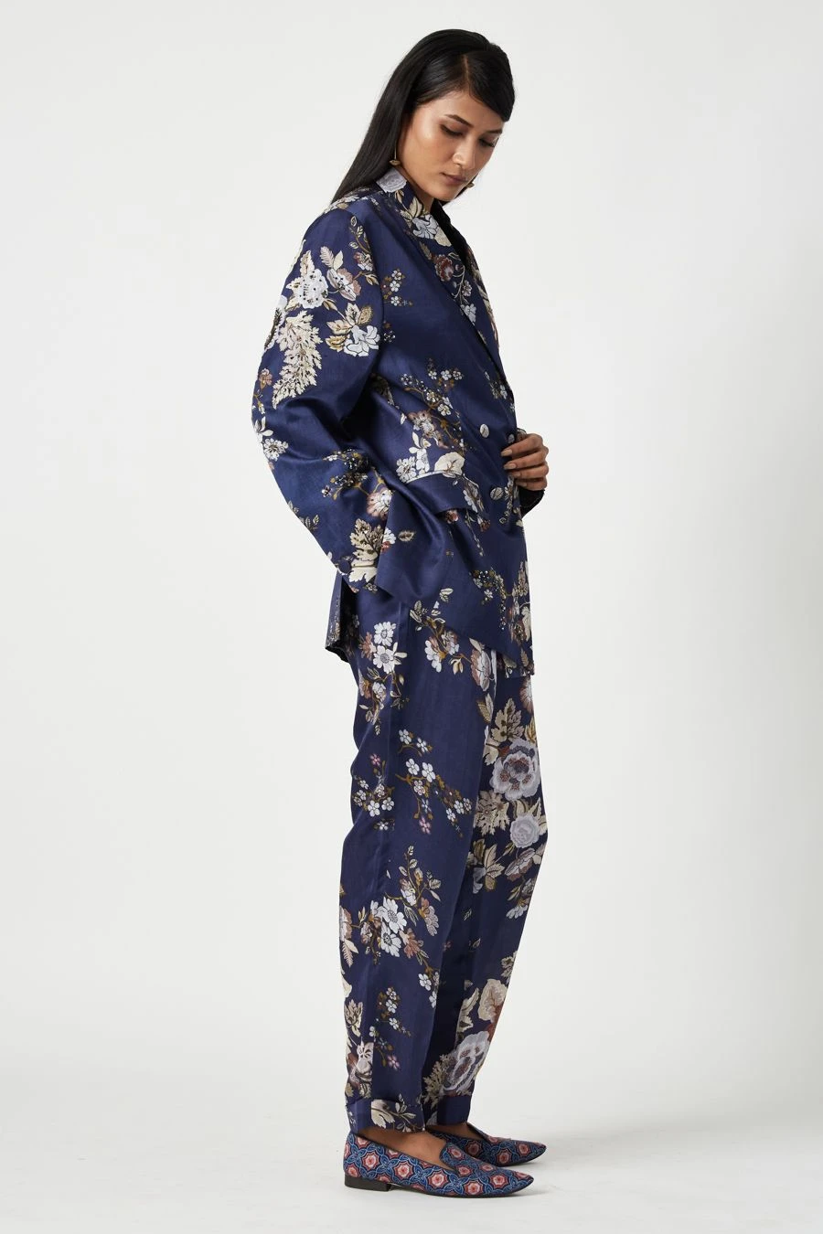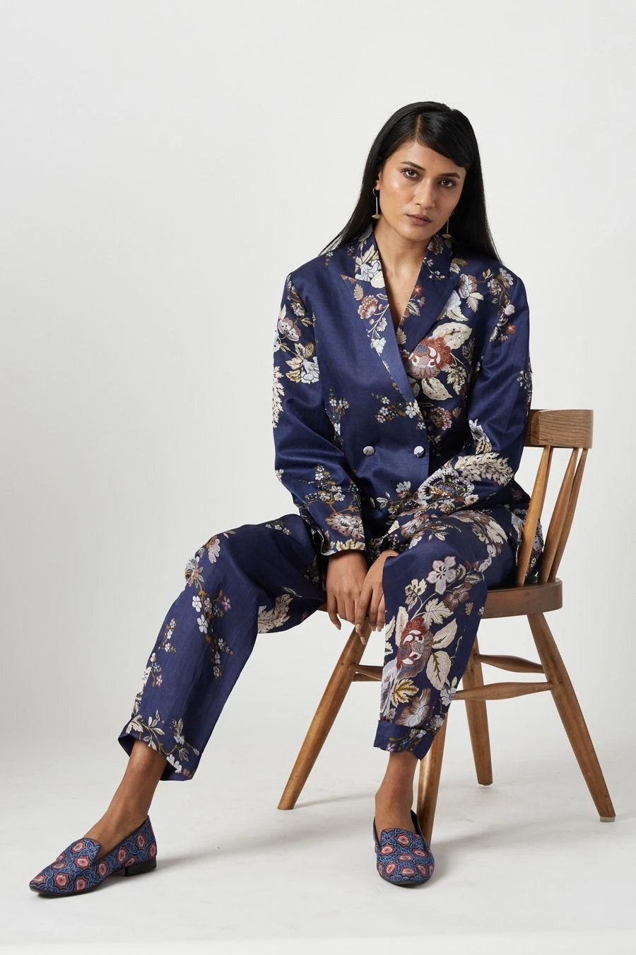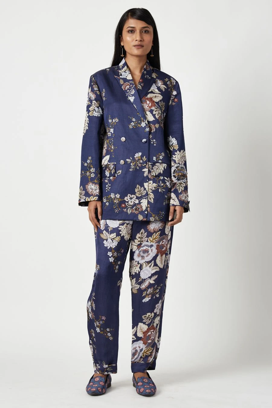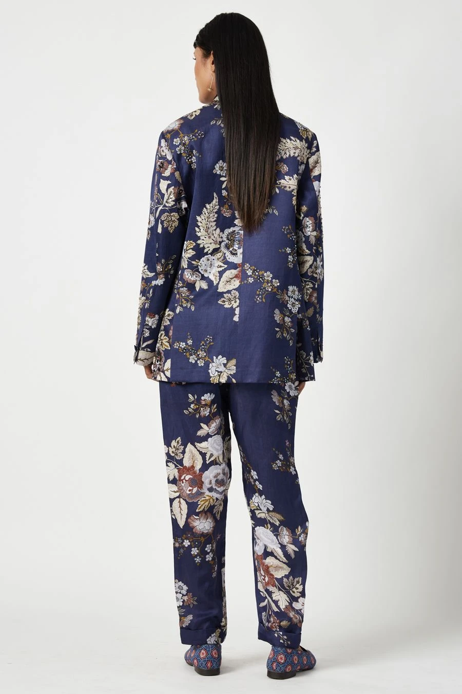 This wardrobe staple can be worn & treasured in its many guises. Crafted in linen satin, this jacket features hand embroidered details all over. Pair this jacket with the Navy Gantri Printed Pants from the collection to complete the set.