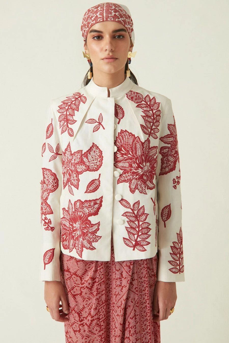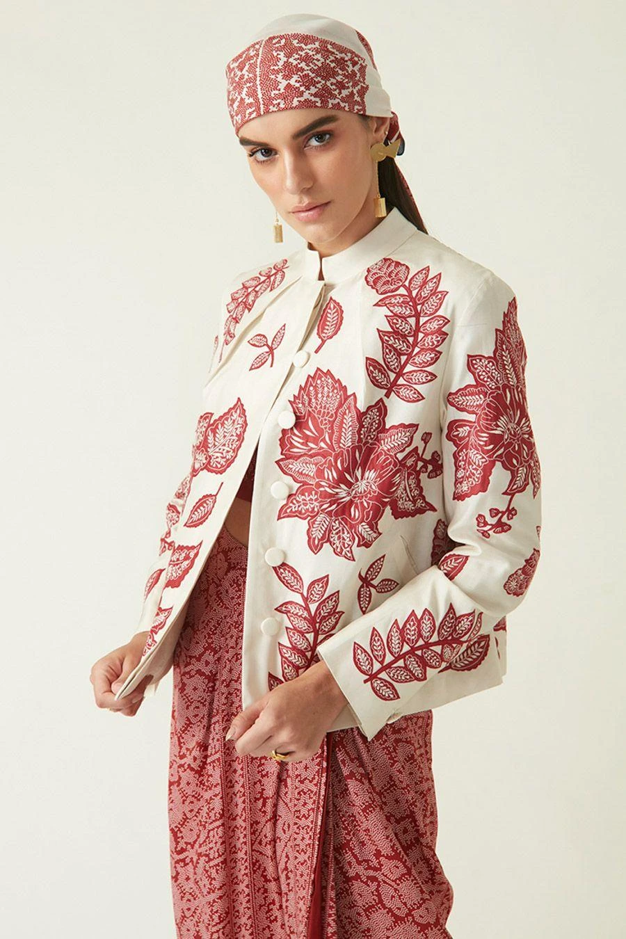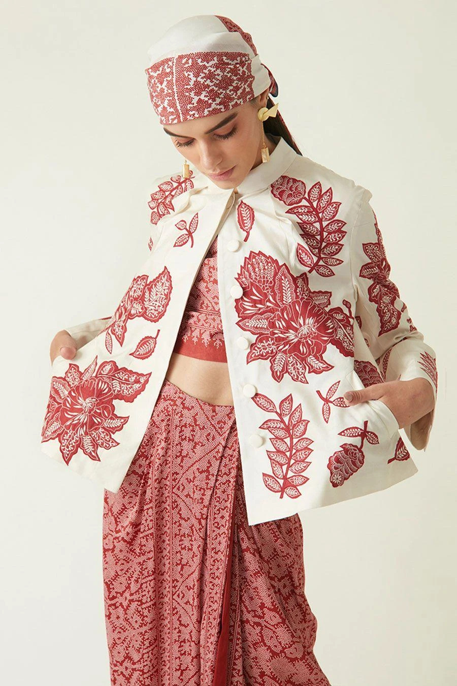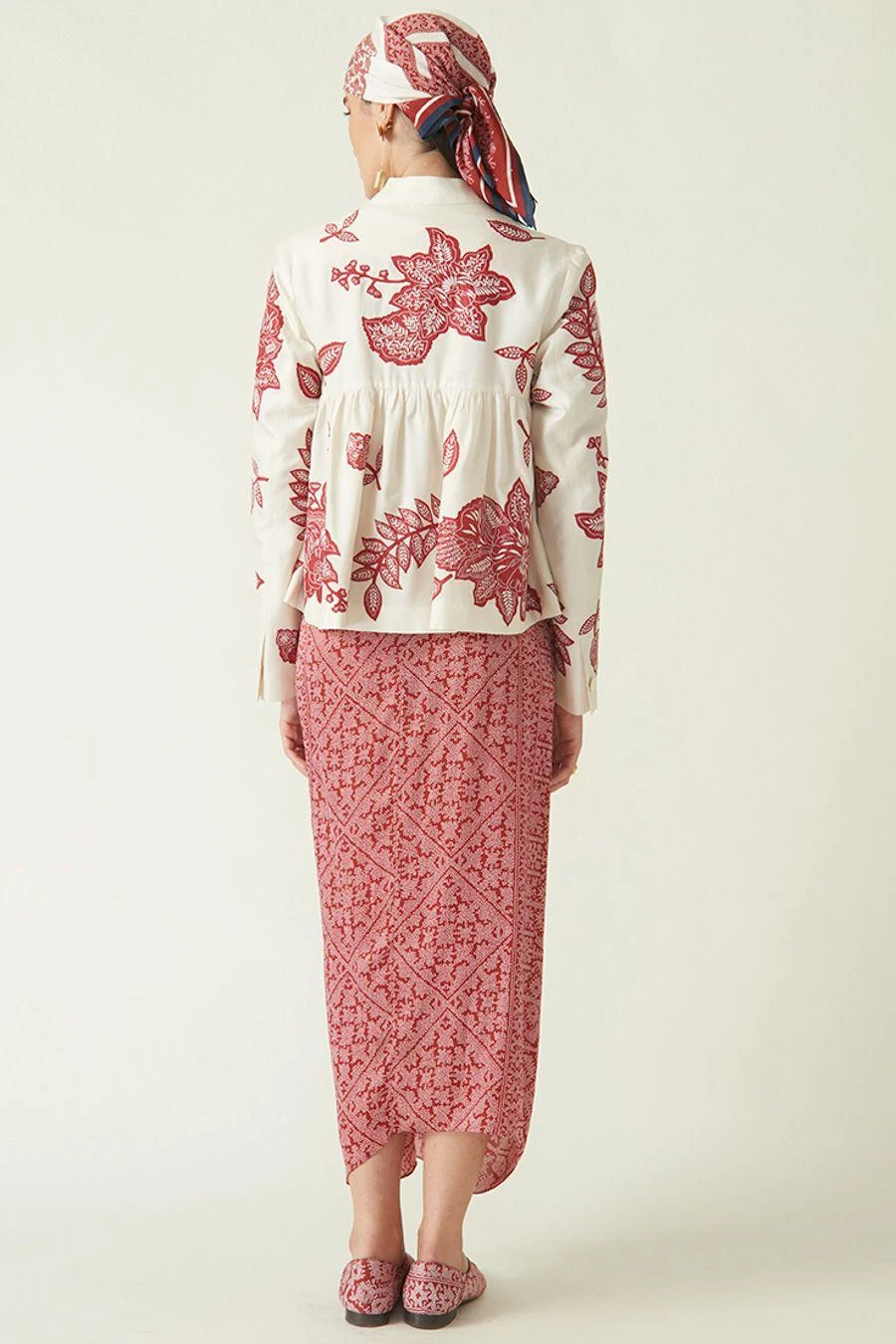 This red sipura skirt falls in the realm of luxe minimalism. Crafted in modal satin, this skirt features a pleated detail at the front to create a draped effect. Style it with the Red & ecru band collar jacket from the collection to complete the set.