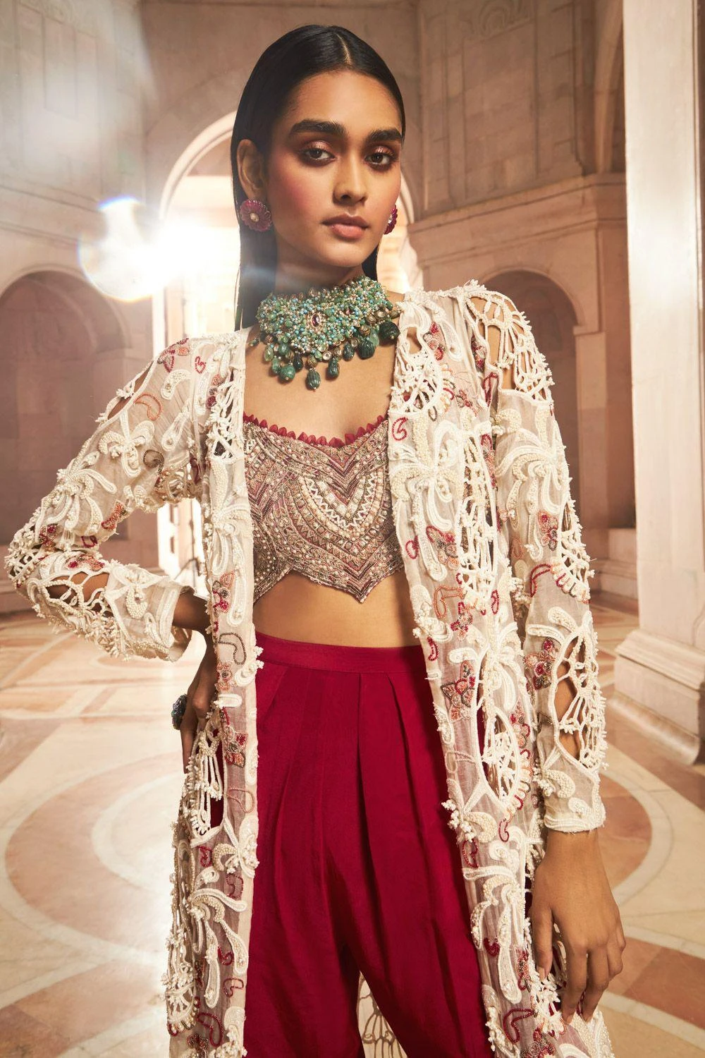 Embrace grandeur in the majestic jacket set, a marvel of intricate artistry with contrast pearl embroidery & detailed cutwork. Paired with bold red pants & a scalloped blouse, this ensemble is perfect for events & gala evenings demanding grace.