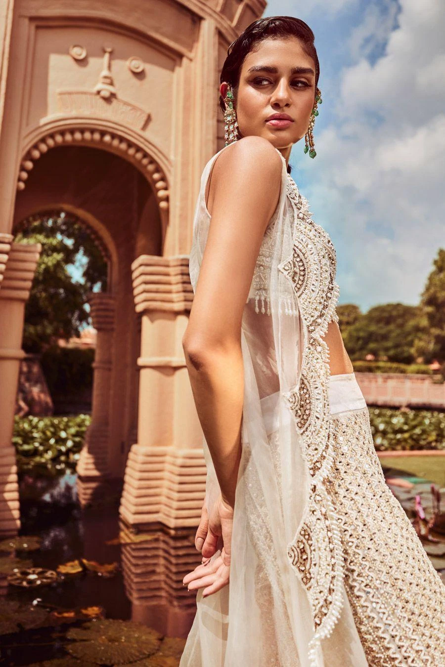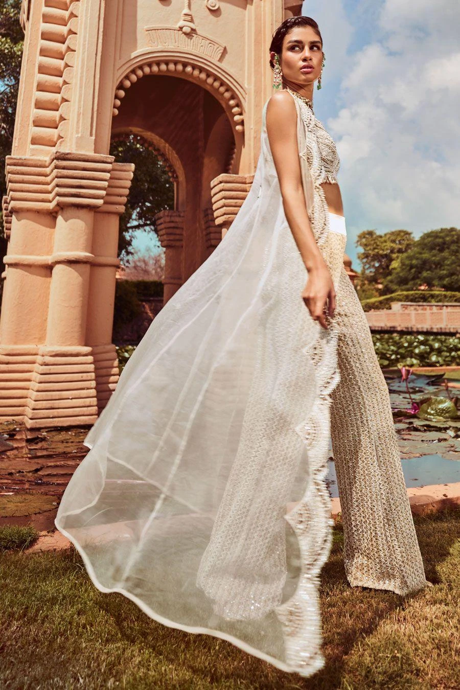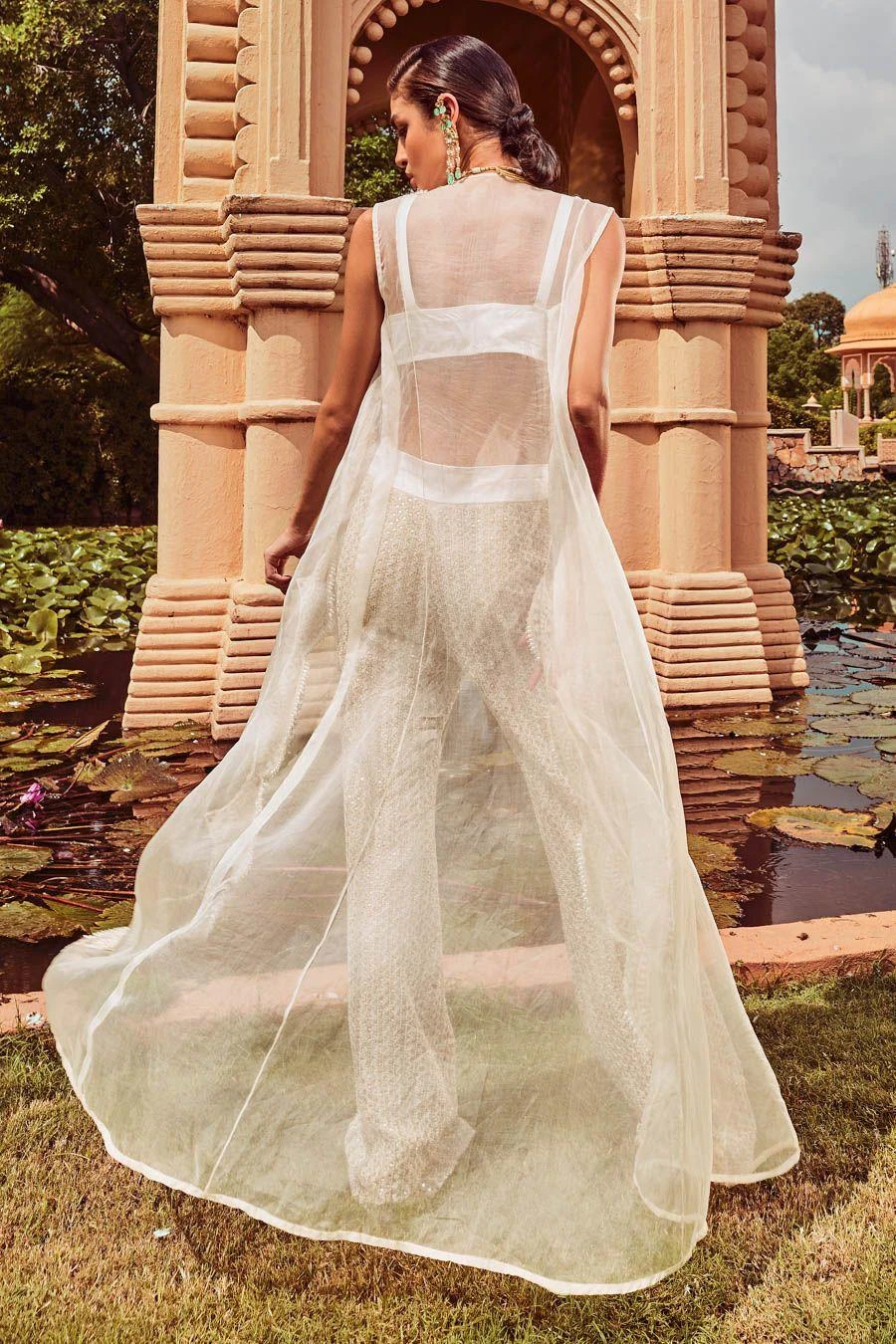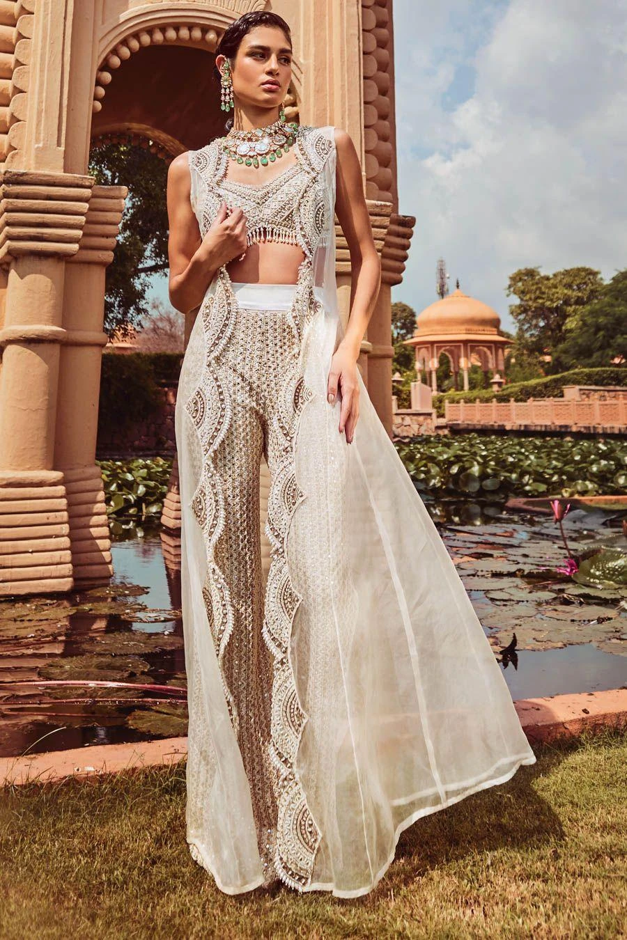 This ivory jacket set is a must-have pre-wedding ensemble you need to stock up on. Crafted in organza, this set features ane embellished long jacket paired with a blouse & palazzo. Add a pair of statement earrings to complete the look.