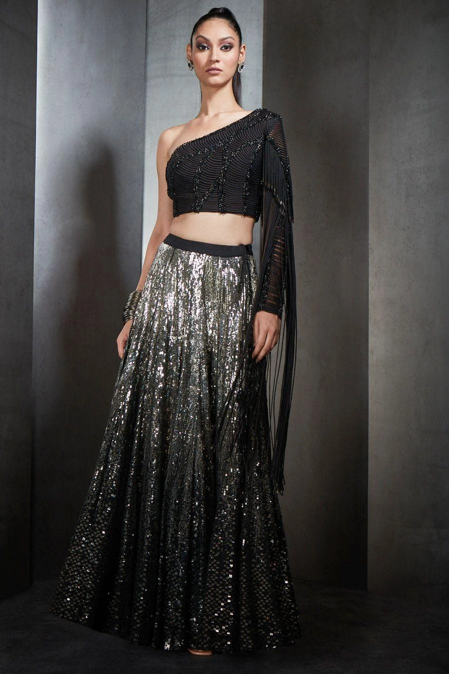 If you’re looking for a head-turning statement-making lehenga set this is the outfit for you. Crafted in tulle, this set features a sequin embellished lehenga paired with a one shoulder tassel blouse.