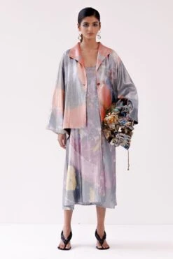 With an artistic allure, the vega corded jacket is hand-embroidered with beads and sequins and features elaborate fringe detailing. This hand-crafted jacket is fashioned out of tulle.