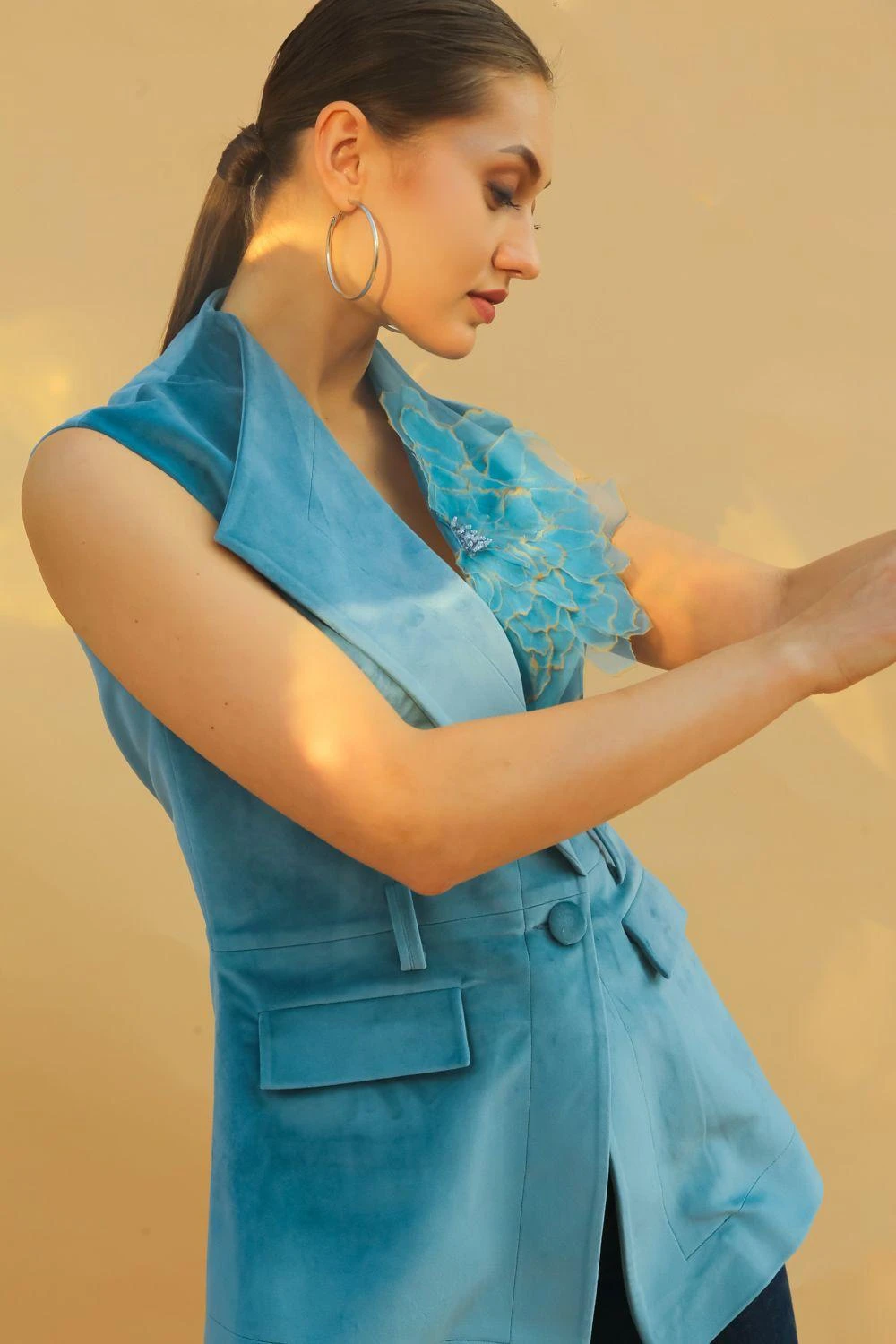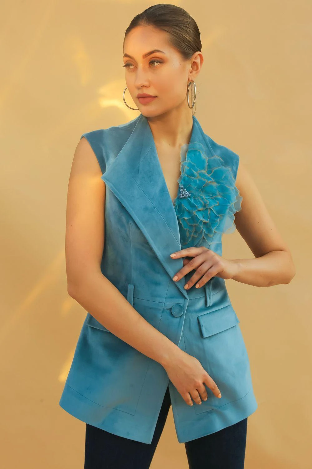 This aqua splash sleeveless jacket is a trendsetting piece to own this season. It is crafted in suede material and enhanced with 3-D organza flower on the collar. You can accentuate your look with a belt that comes along.