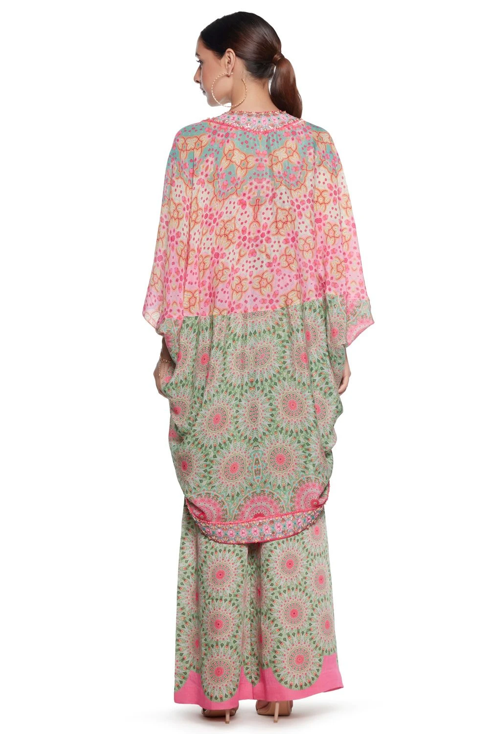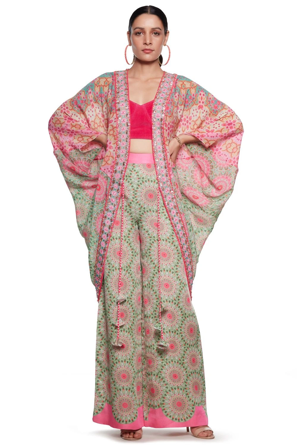 This pink & green chic cape will make the perfect layer for your festive looks. It is cut in printed pure crepe and accented with delicate embellishments. This versatile cape can be styled with both festive & holiday looks.