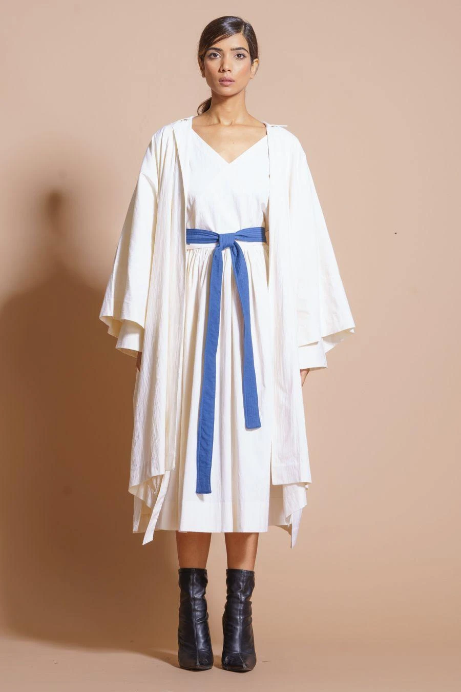 Take your layering game a notch higher with this off white jacket. Crafted in viscose lycra, this relaxed fit trench style jacket features flared sleeves. Pair it with the Off white gathered Rosemary dress from the collection to complete the set.