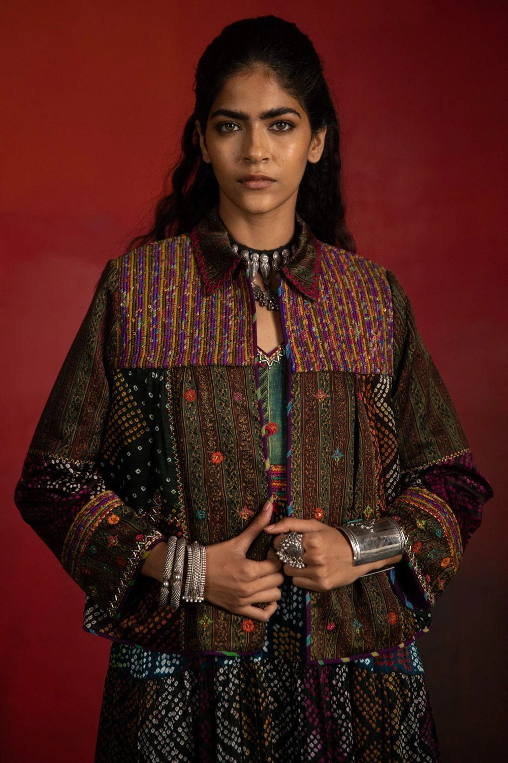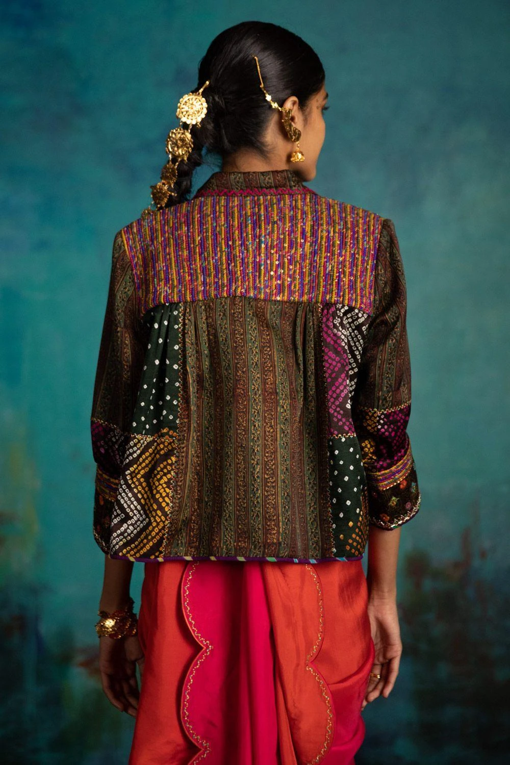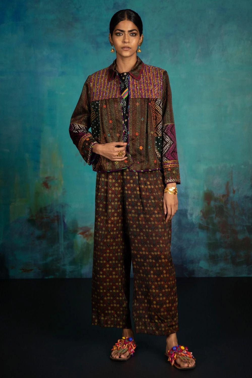 This brown jacket is set in a luxe modal & gajji silk. It is mixed with hand block print & traditional hand embroidery techniques. Handmade by female artisans this piece is perfect to layer with your daytime looks.