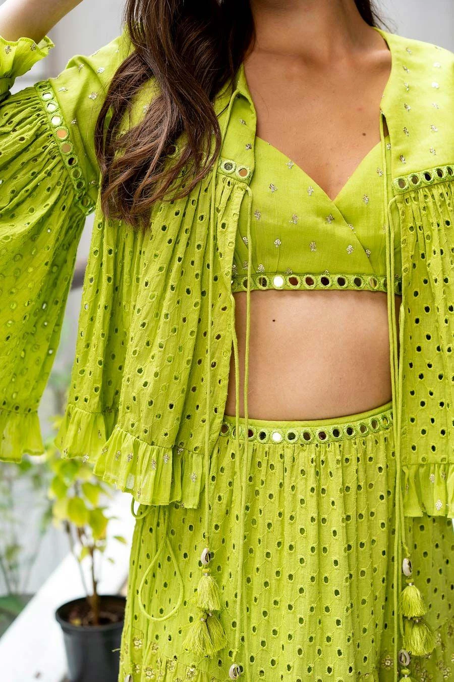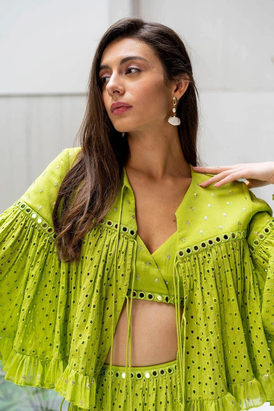 Delicate hakoba embroidery dances across the luxurious fabric, while cascading ruffles add a touch of whimsy. This statement piece effortlessly combines femininity and flair, making it a must-have for the fashion-forward.