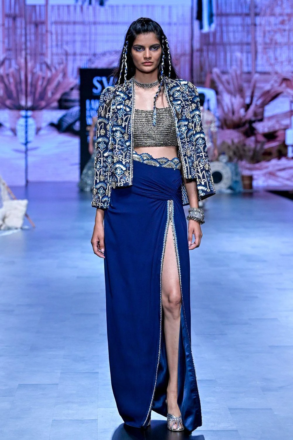 Step into opulent elegance with this embroidered jacket set. This ensemble is a testament to the perfect fusion of intricate craftsmanship and modern sophistication, setting the stage for a remarkable look.
