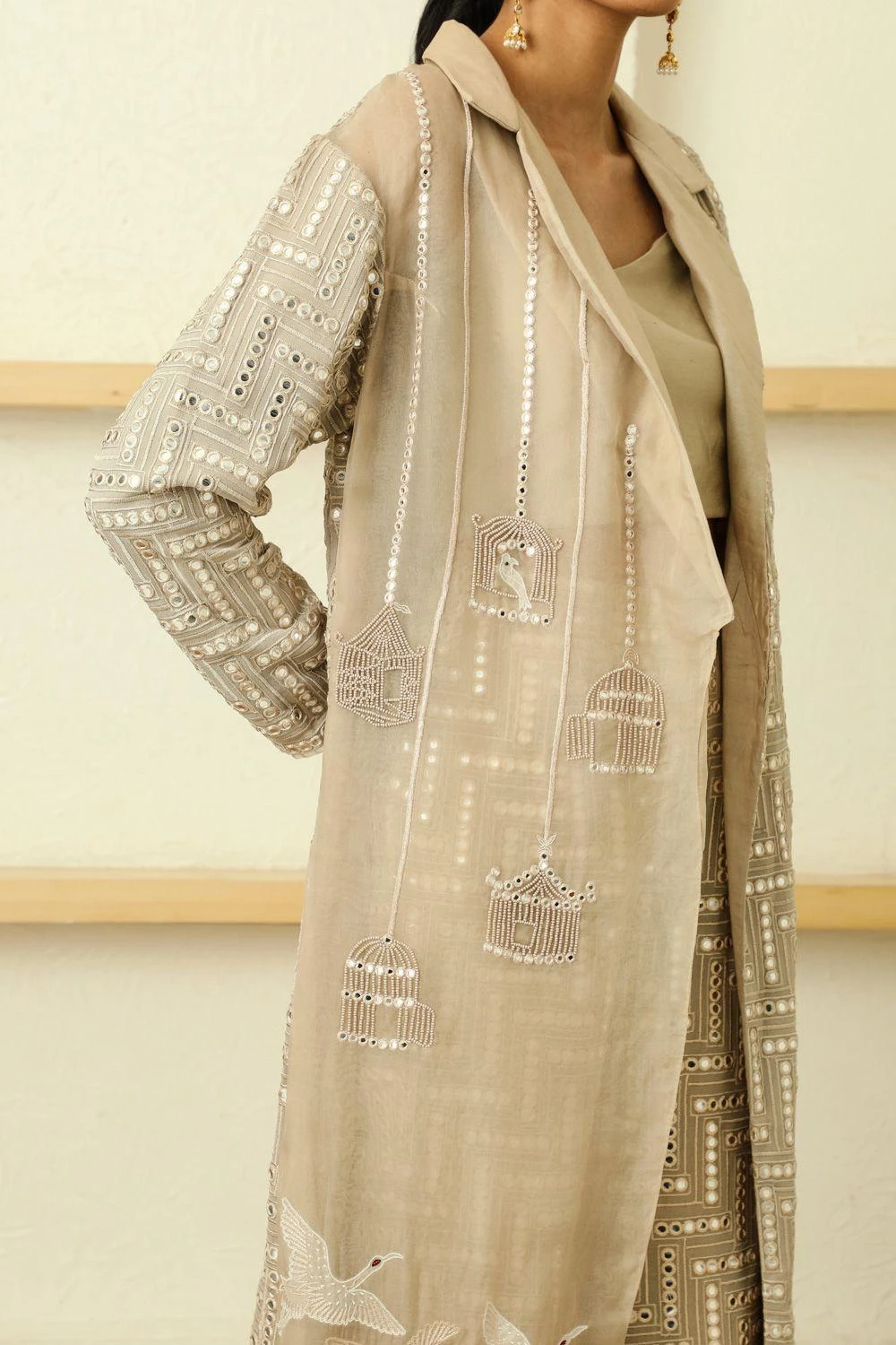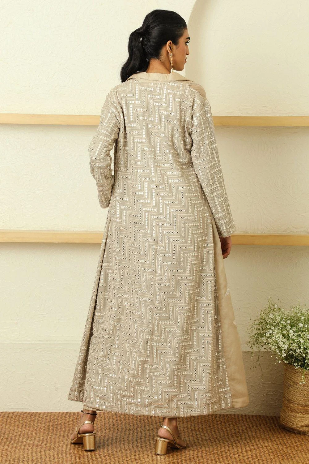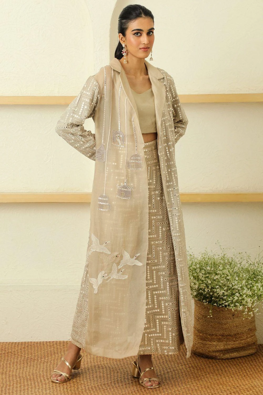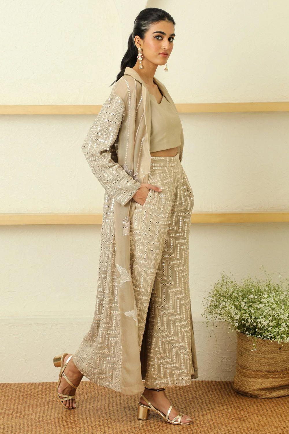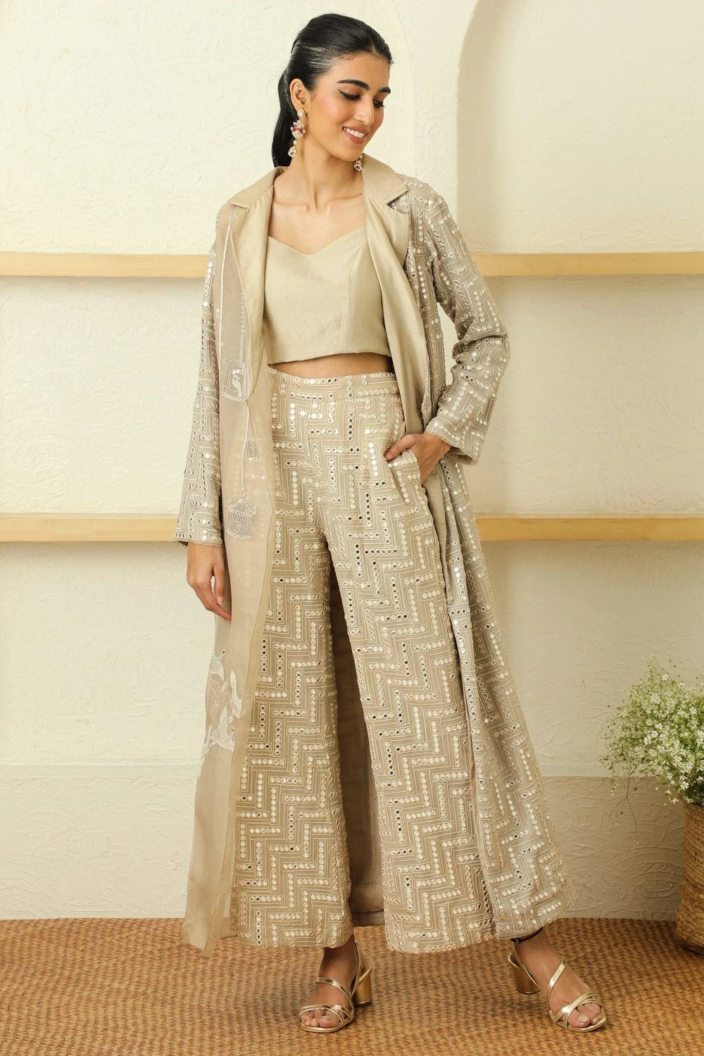 An outfit like this beige jacket set can be worn throughout the year for various festivities. It features a georgette long jacket with notch collar, paired with wide legged matching pants. The set is computer embroidered with great precision.