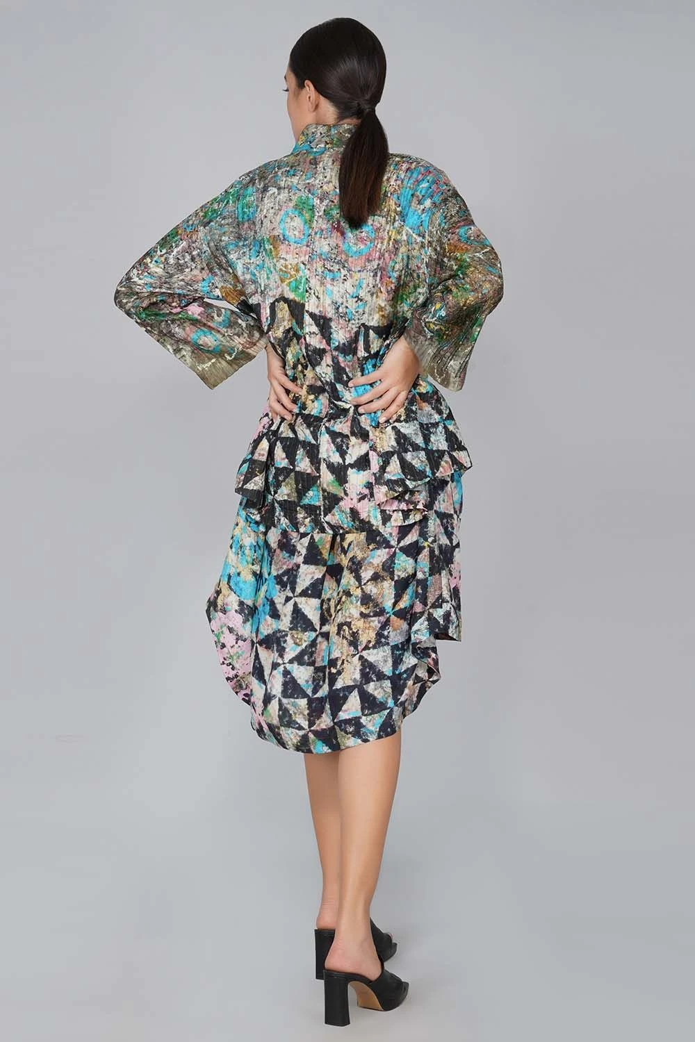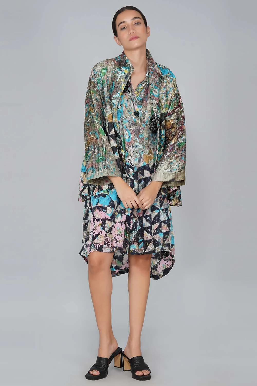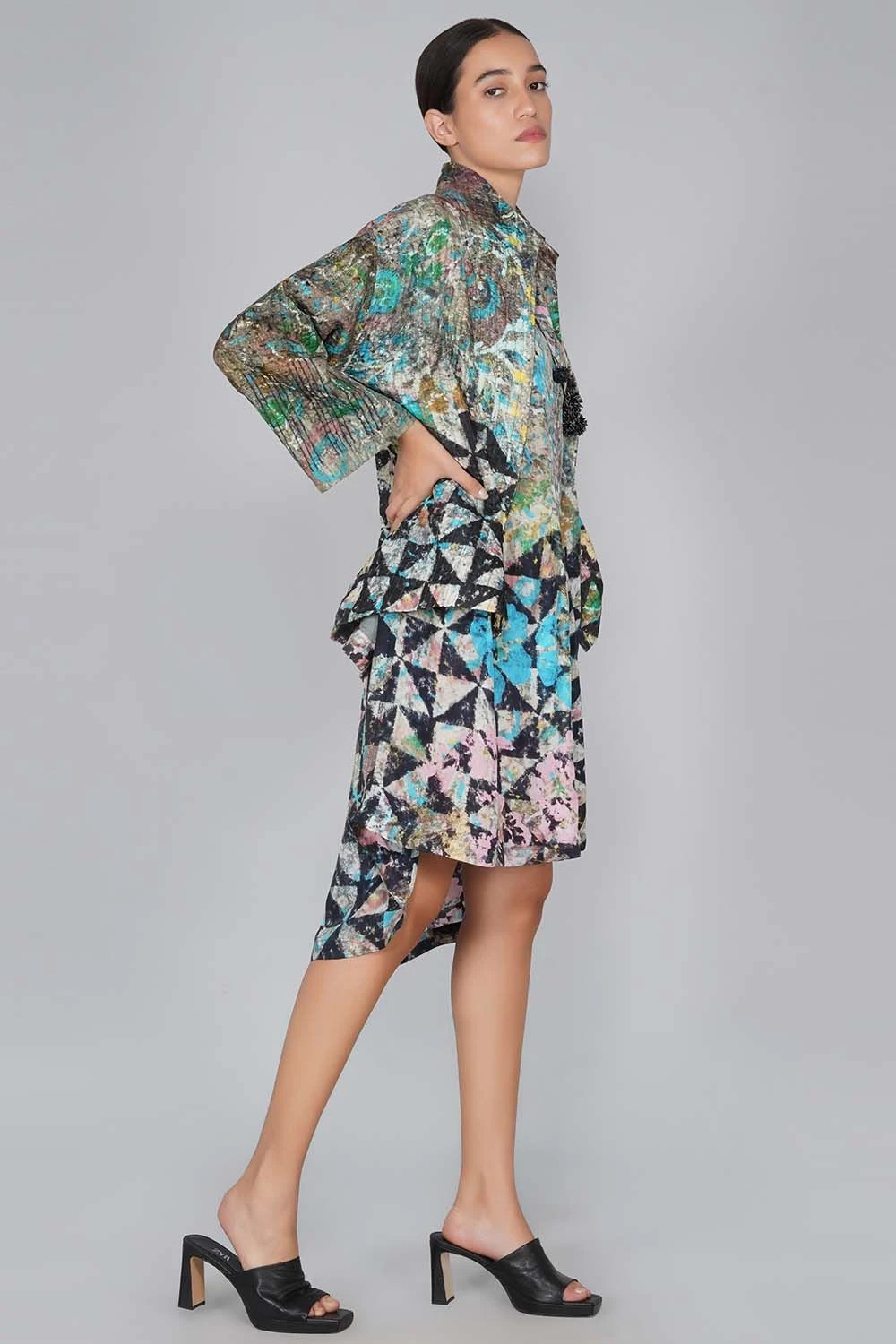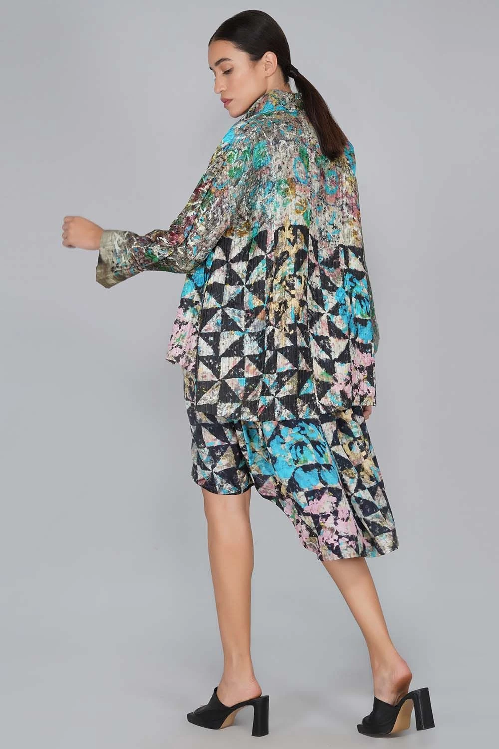 Amidst the artsy contemporary fashion scene, an abstract layer is a definite investment for your wardrobe. This silk impressionist quilted jacket is a sure fire-winner. Adorn it over your basic fits to elevate your look in a second.