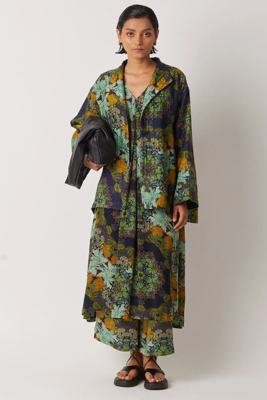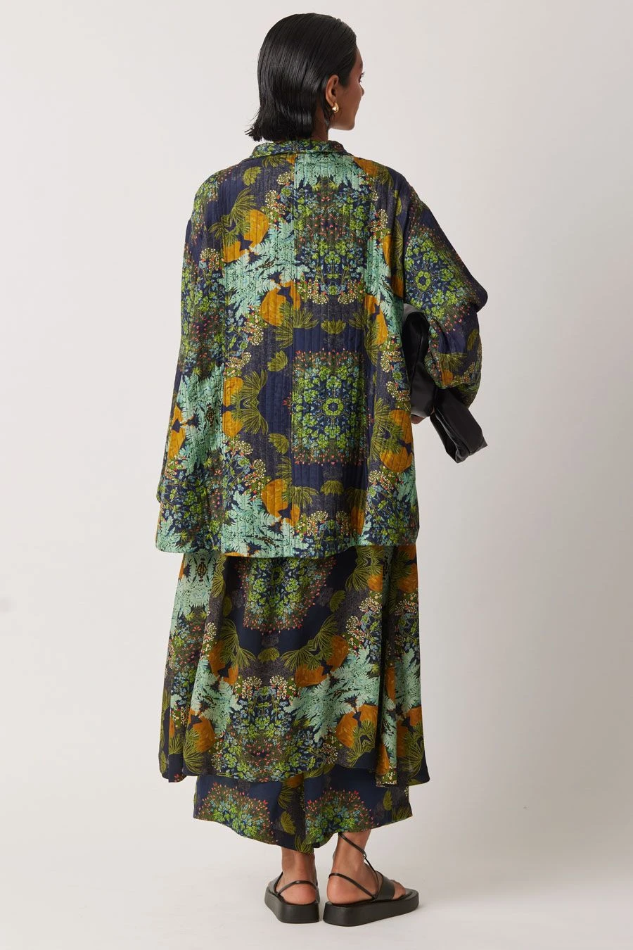 Witness the mesmerizing metamorphosis of chaos into captivating geometric patterns adorning this Yavi masterpiece. Crafted from luxurious silk, this quilted jacket with a lapel collar embodies a harmonious blend of artistry and sophistication.