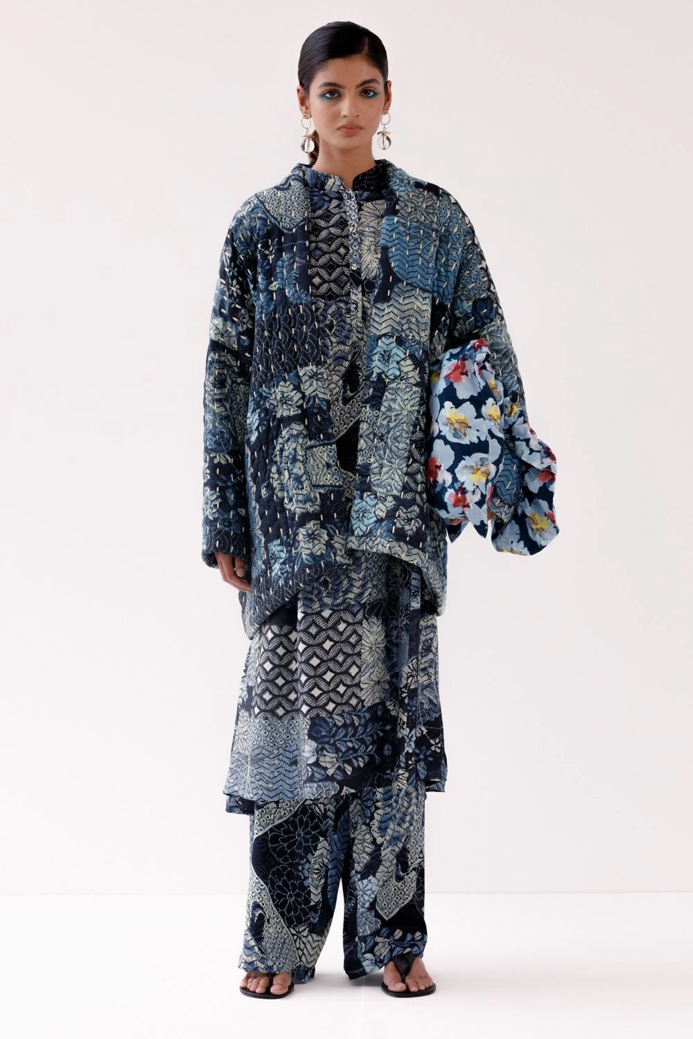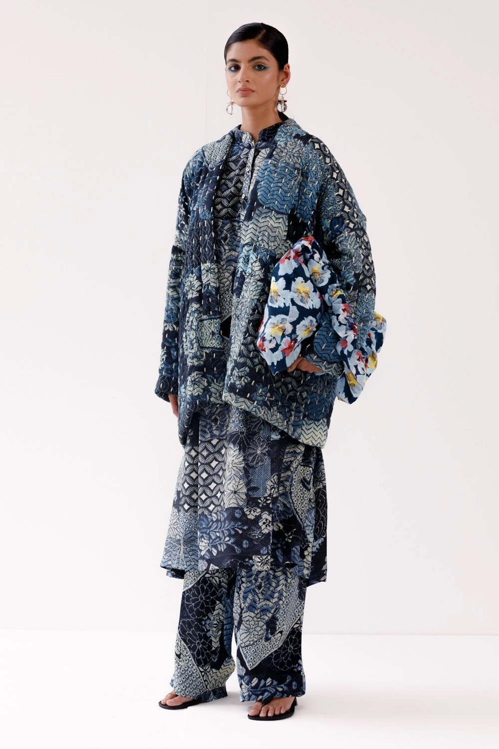 Embrace the warmth and style of this hand-quilted jacket, featuring intricate kantha stitch detailing, all crafted from 100% cotton. A cozy and chic staple for the winter season.