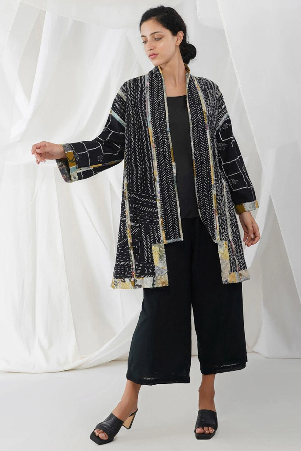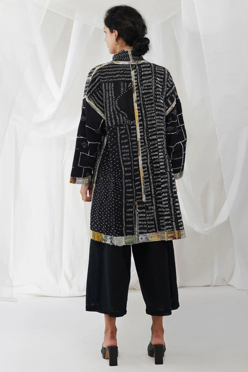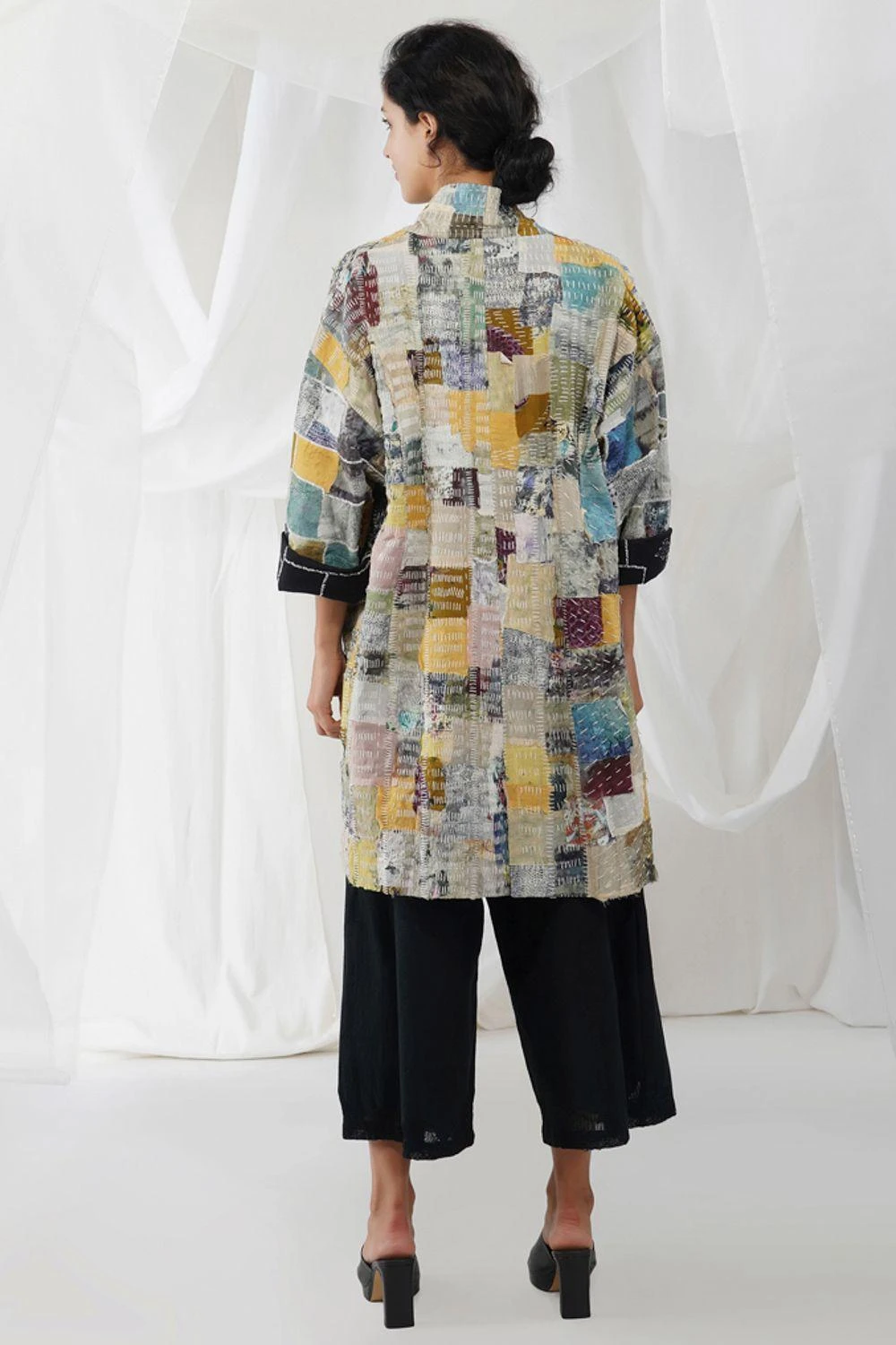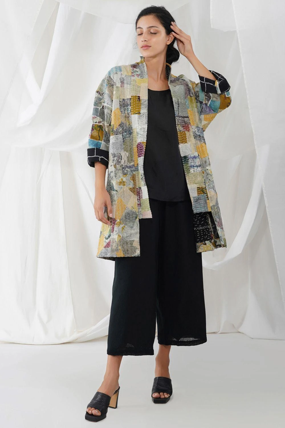 This upcycled reversible patchwork jacket is an embodiment of the designer’s commitment to sustainability, craftsmanship and innovation in fashion. It is crafted in fabric waste and detailed with kantha embroidery.